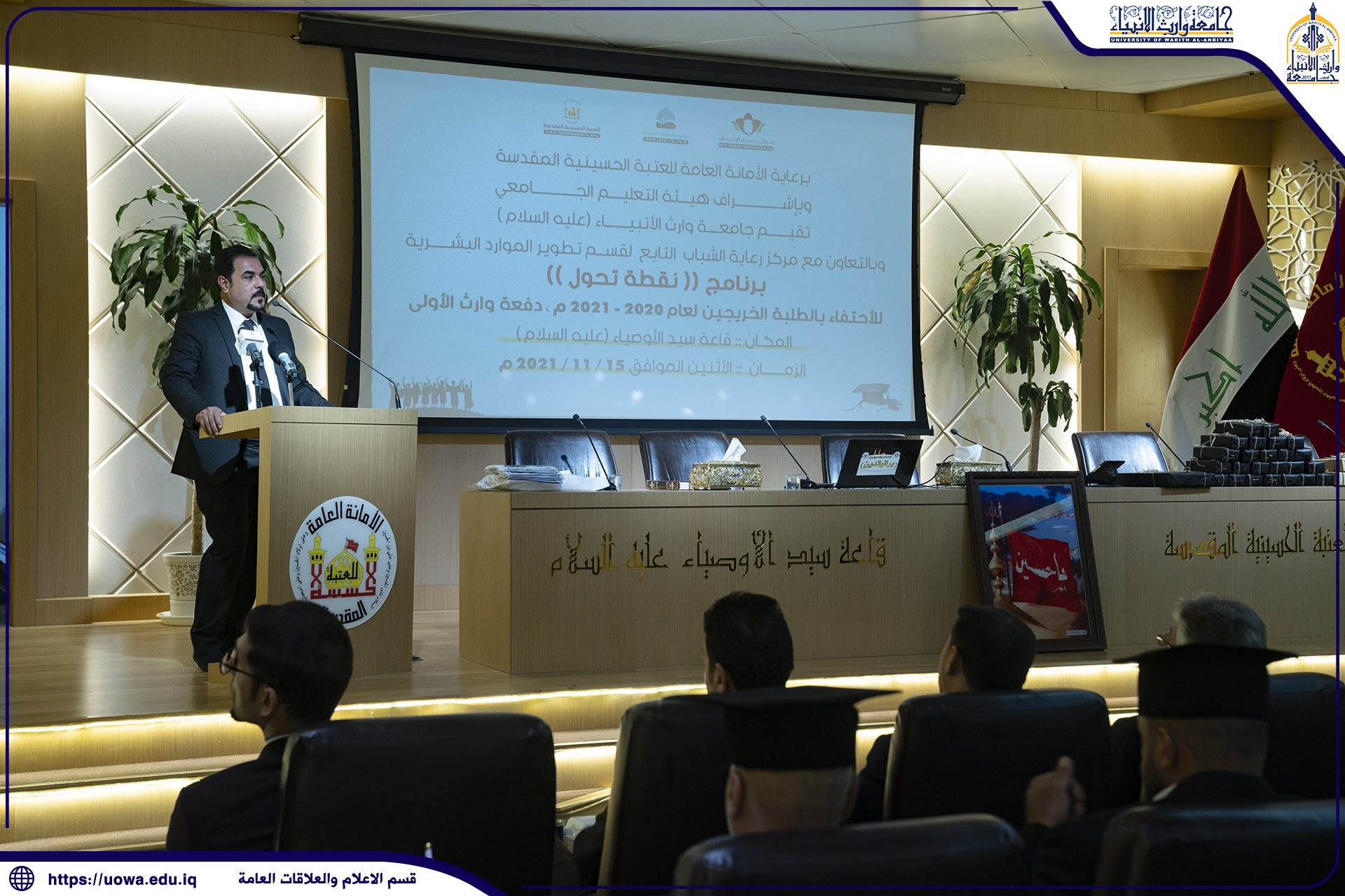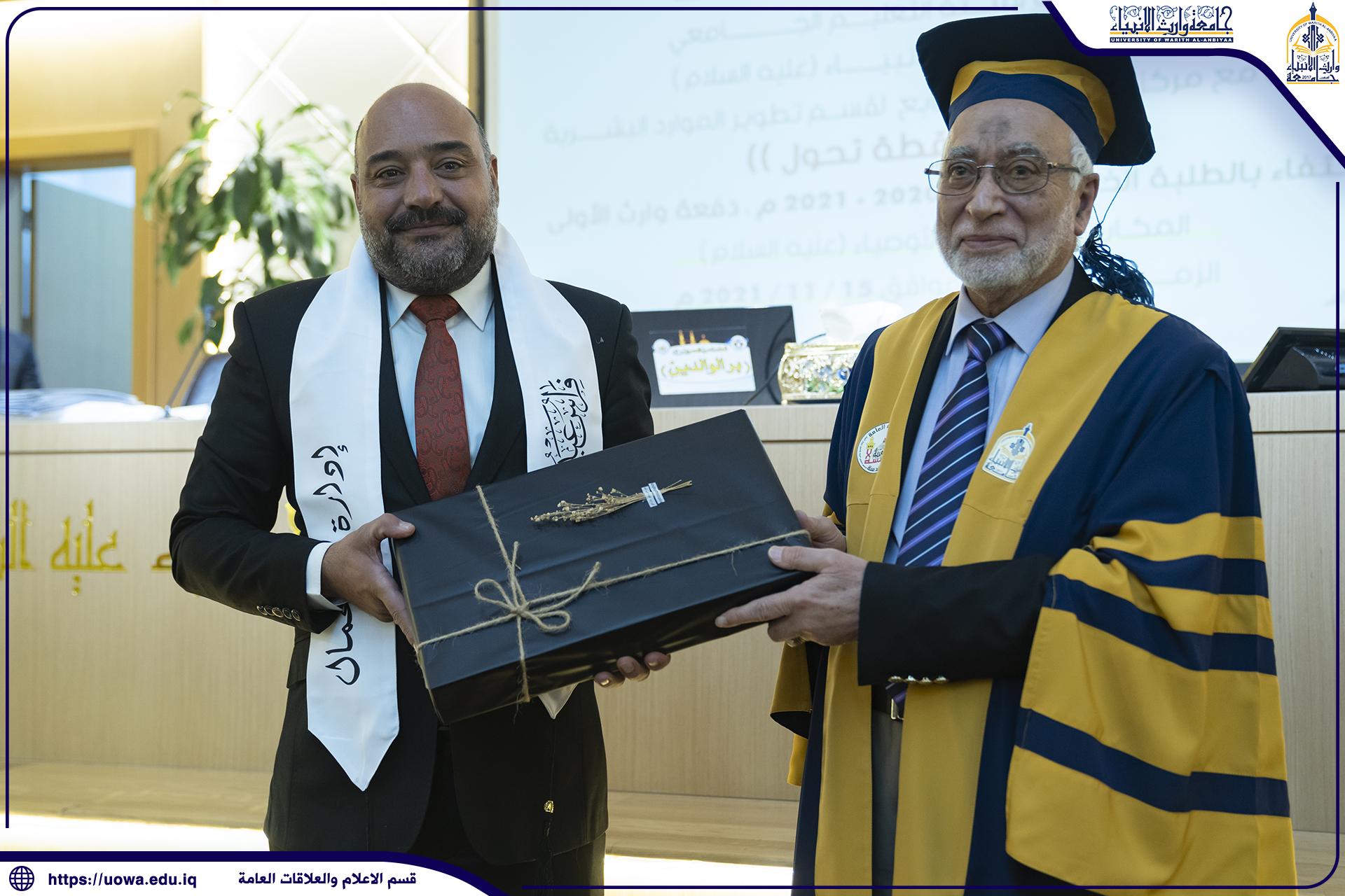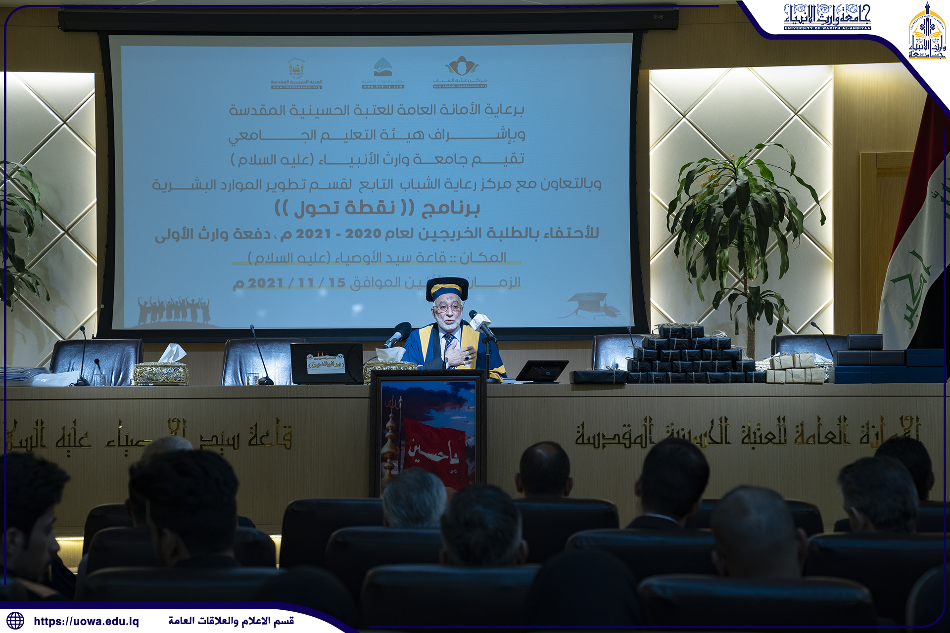 وجرى الحفل البهيج في قاعة سيد الأوصياء بالصحن الحسيني الشريف، بحضور السيد رئيس الجامعة الاستاذ الدكتور طالب حسن موسى والسادة مساعدي رئيس الجامعة والسادة عمداء الكليات واعضاء هيئة التدريس واولياء امور الطلبة .