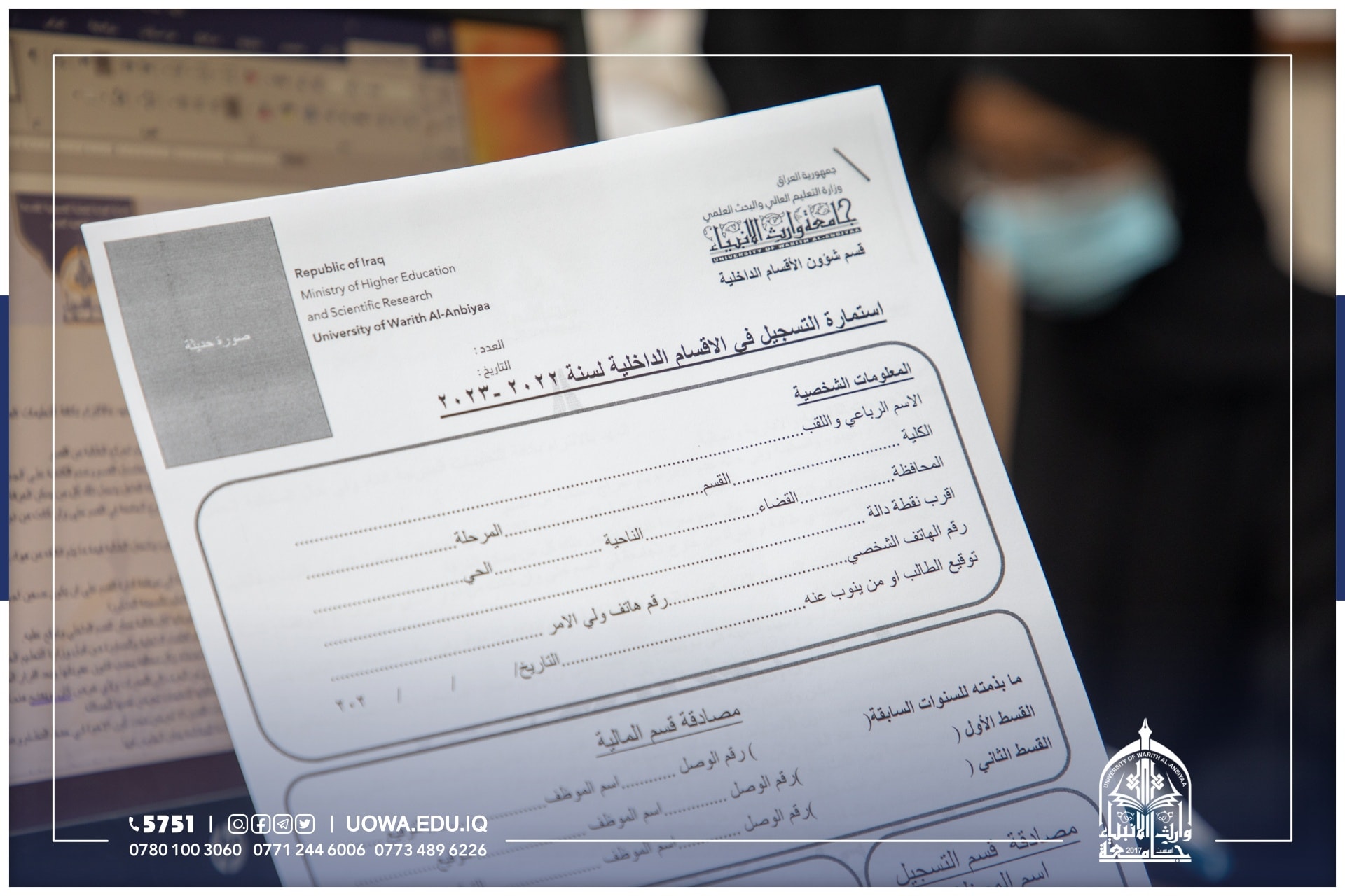 يستمر قسم شؤون الاقسام الداخلية في جامعة وارث الانبياء(عليه السلام) باستقبال الطلبة الاعزاء الراغبين بالتسجيل على الاقسام الداخلية.