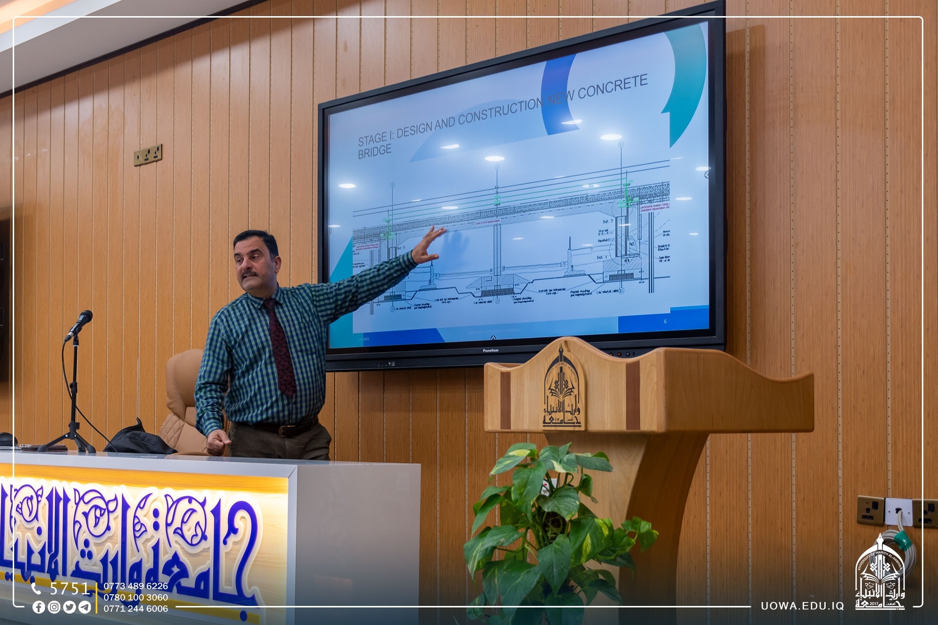 اقام قسم الهندسة المدنية بالتعاون مع قسم الشؤون العلمية في جامعة وارث الانبياء(عليه السلام) ندوة علمية بعنوان(Modern Construction Technology Using Hydraulic Jacks Systems Rapid Bridge Replacement on 5 Days Timelapse) ، قدمها المتخصص في تصميم الهياكل الحديدية وتصميم المنشئات الكونكريتية الأستاذ الدكتور هيثم حسن متعب الدعمي من جامعة بابل.