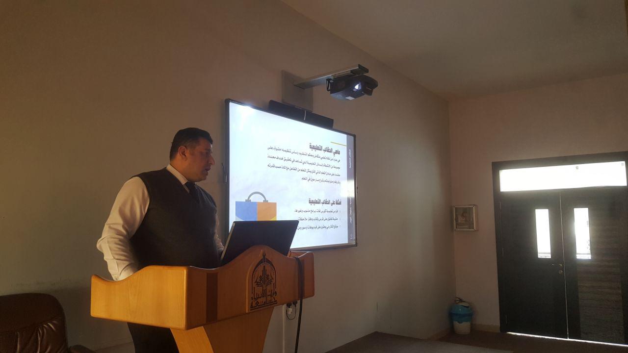 أقام قسم ادارة الاعمال في كلية الادارة والاقتصاد حلقة نقاشية بعنوان (الحقائب التعليمية) قام بألقائها الاستاذ (م.م علي عزيز)  يوم الاربعاء المصادف 26\2\2018وقد حضر الجلسة كل من سيادة عميد الكلية أ.د.عامر العطوي و رئيس قسم المحاسبة م.د.فهد الشمري ورئيسة قسم ادارة اعمال م.د.نضال المالكي والسادة التدريسيين مع مجموعة من الطلبة وقد ركزت الورشة على توضيح مفهوم الحقائب التعليمية وطريقة انشائها وكيفية  توظيفها  لخدمة الجانب التعليمي لطلبة كليتنا