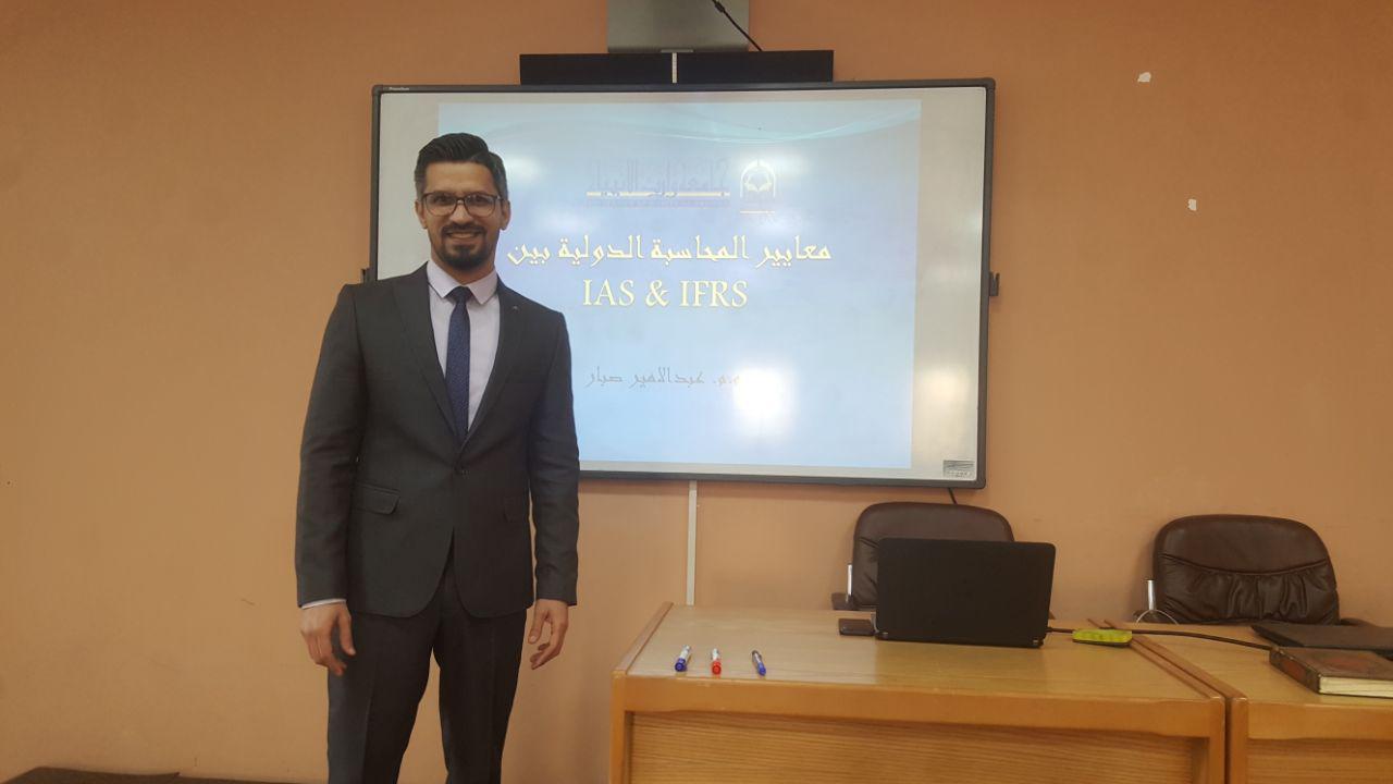أقام قسم ادارة الاعمال في كلية الادارة والاقتصاد حلقة نقاشية بعنوان (معايير المحاسبة الدولية بين IAS&IFRS) قام بألقائها الاستاذ (م.م عبدالامير صبار) يوم الاثنين المصادف 7\1\2019وقد حضر الجلسة كل من سيادة عميد الكلية أ.د.عامر العطوي و رئيس قسم المحاسبة م.د.فهد الشمري و رئيسة قسم ادارة الاعمال د. نضال المالكي والسادة التدريسيين وقد ركزت الورشة على توضيح مفهوم المعايير  الدولية وطريقة انشائها وكيفية توظيفها لخدمة الجانب التعليمي لطلبة كليتنا