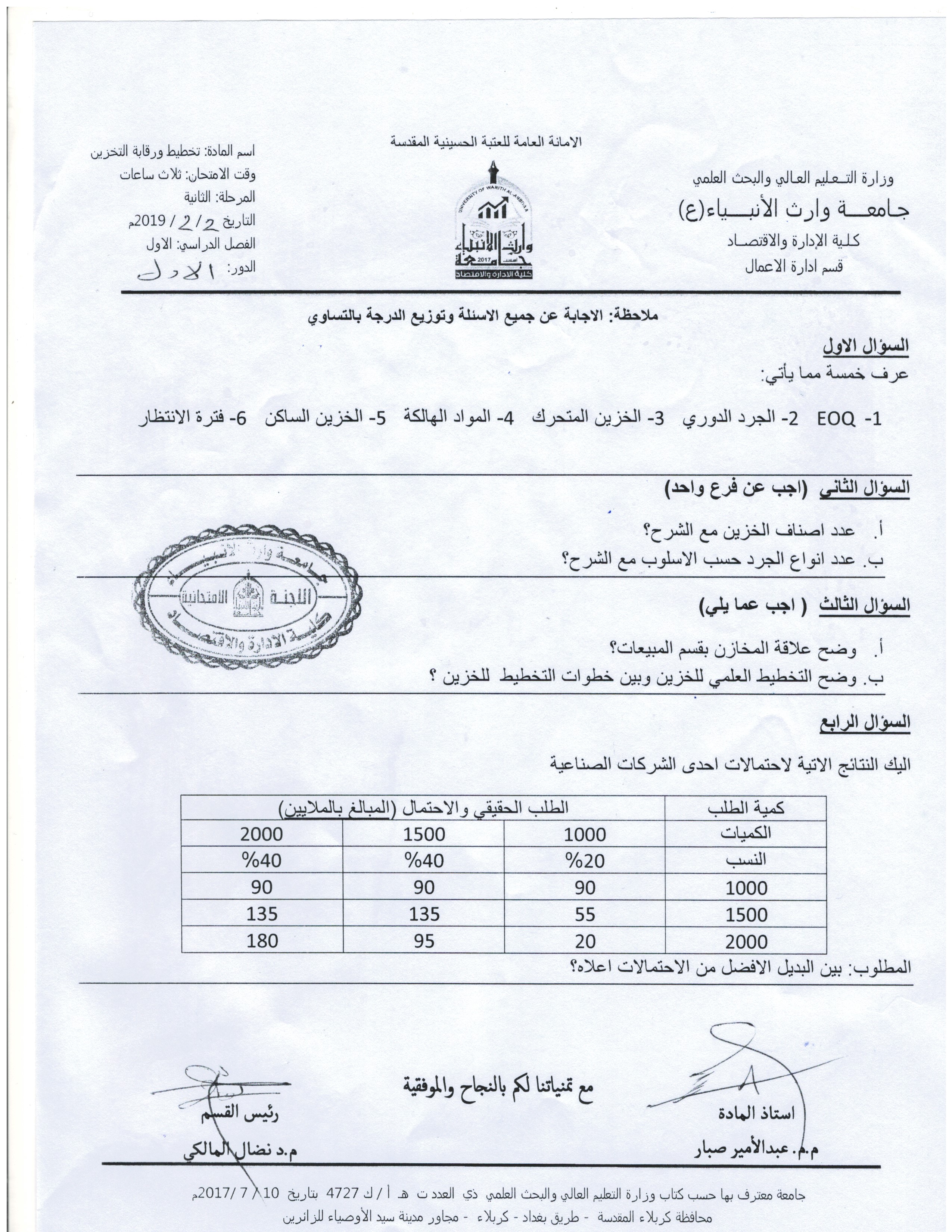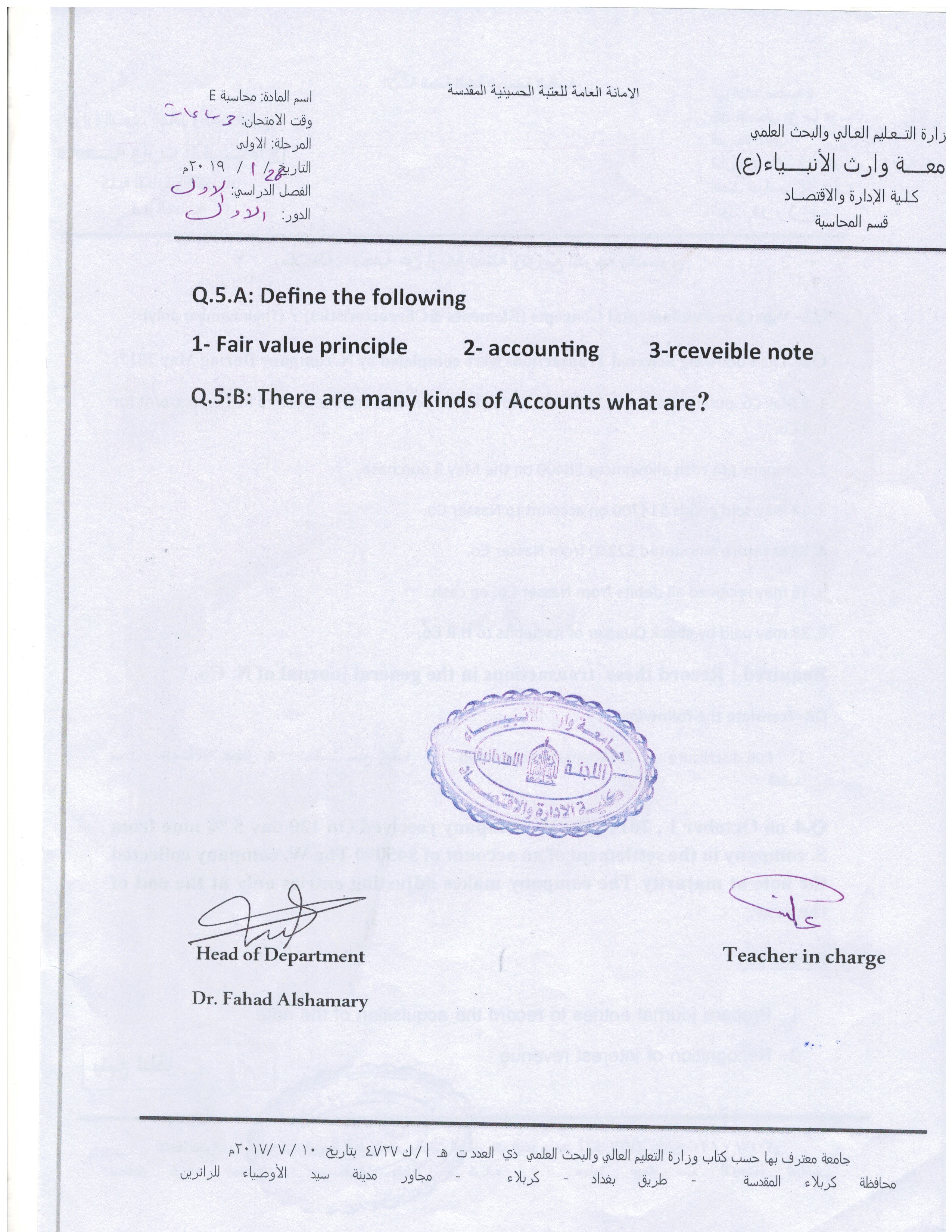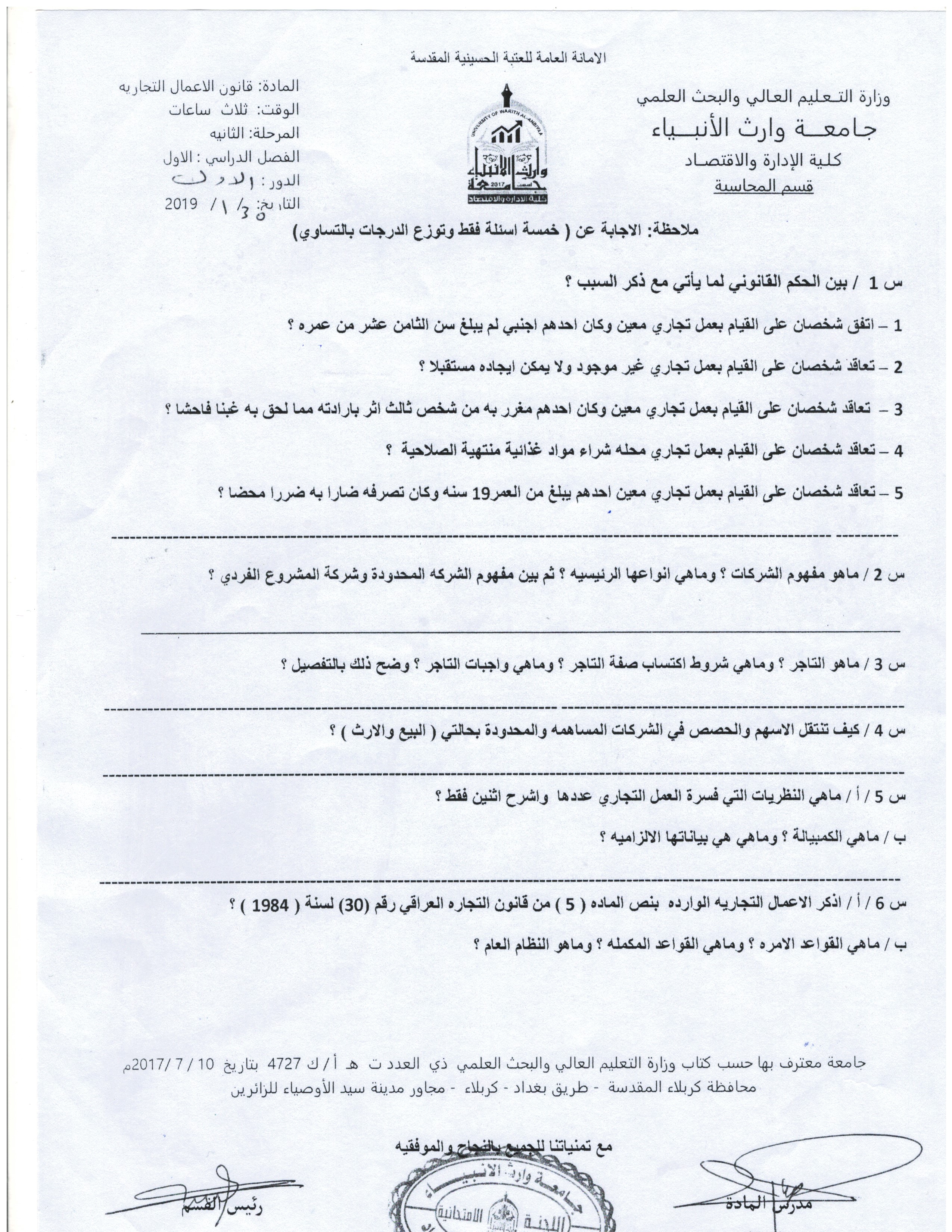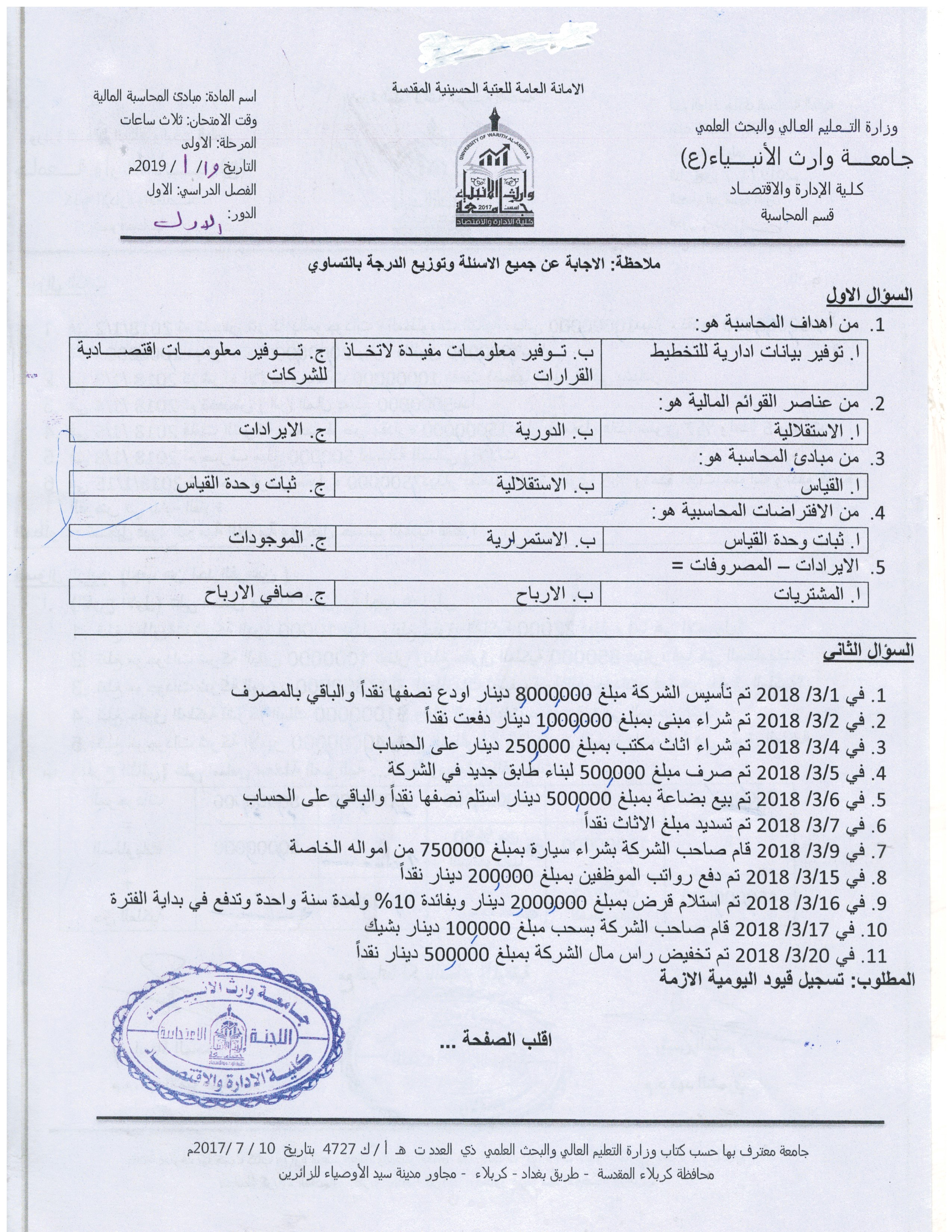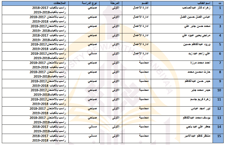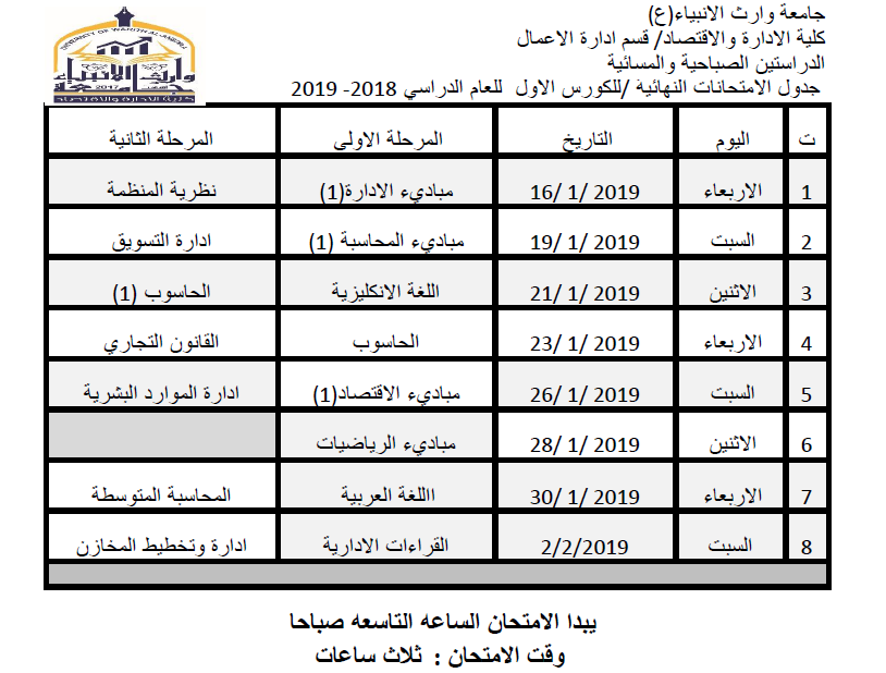 في حالة وجود عطلة رسمية يوم الثلاثاء الموافق 11/9/2018سيكون امتحان مادة الرياضيات لقسم المحاسبة في يوم الاربعاء الموافق 12/9/2018وامتحان مادة مبادئ الاقتصاد(2) لقسم ادارة الاعمال في يوم السبت الموافق 15/9/2018يرجى الانتباه لذلك