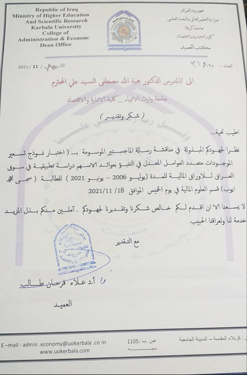 شاركت الدكتورة هبة الله مصطفى عضوا في مناقشة علمية لطالبة الماجستير/ قسم العلوم الماليه والمصرفية/جامعة كربلاء (سجى محمد ايوب) في يوم الخميس المصادف ١٨/١١/٢٠٢١ عن رسالتها الموسومة (اختبار نموذج تسعير الموجودات متعدد العوامل في التنبؤ بعوائد الاسهم) وتألفت لجنة المناقشة من السادة: