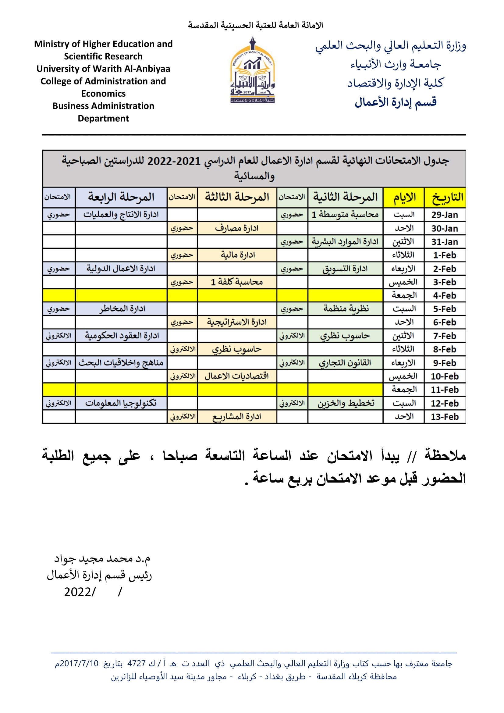 جدول الامتحانات النهائية لقسم ادارة الاعمال للعام الدراسي 2021-2022 للدراستين الصباحية والمسائية