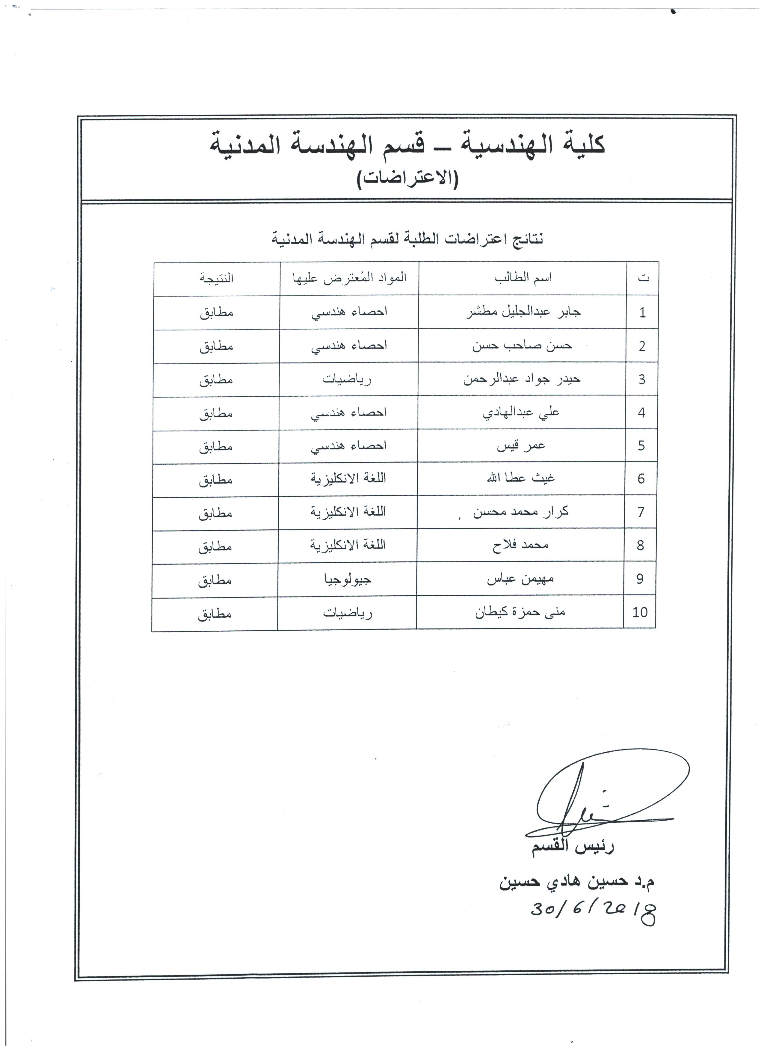 الى طلبة قسم الهندسة المدنية بعد تدقيق كافة الاعتراضات المقدمة كانت جميع النتائج مطابقة حسب ماموضح بالجدول