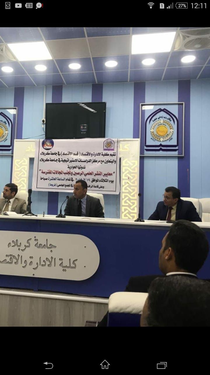شارك الدكتور حاكم سماوي الجبوري رئيس قسم هندسة الكييف والتبريد بحلقة حوارية في جامعة كربلاء حول البحث العلمي والنشر في المجلات الرصين وتجنب النشر في المجلات المفترسة... حيث عرض الدكتور حاكم اهم معايير النشر العلمي الرصين وكيفية معرفة قواعد البيانات العالمية ودور النشر مثل تومسون رويتر وسكوباس... وفي نهاية الحلقة تمت الاجابة عن بعض الاستفسارات من قبل الحضور... وقد شكر المنظمين الدكتور حاكم على اسلوبه الشيق في الطرح العلمي... وقدمت له شهادة تقديرية من قبل مركز الدراسات الستراتيجية في جامعة كربلاء