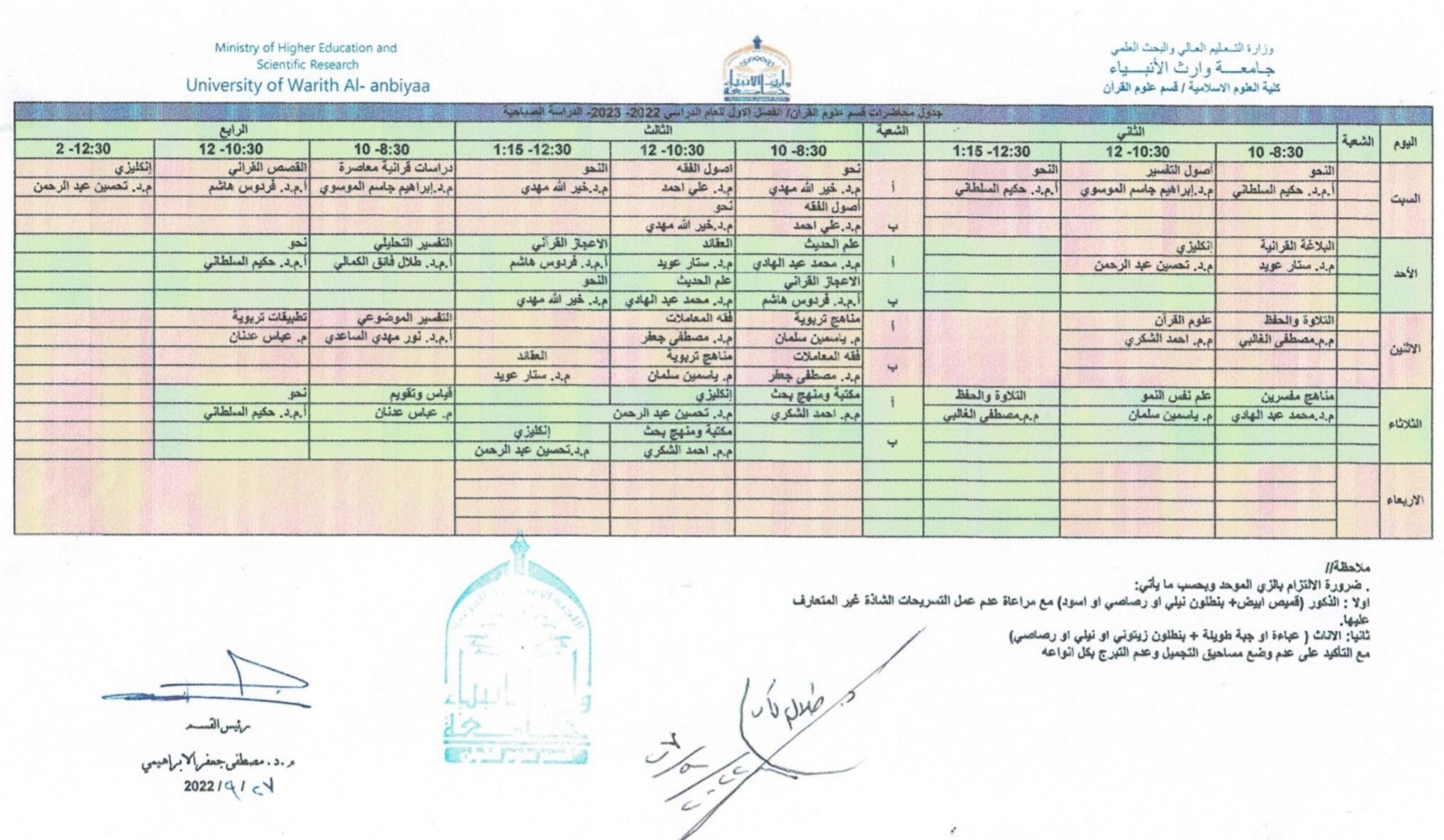 جدول الدروس الاسبوعي لقسم علوم القران للعام الدراسي 2022-2023...