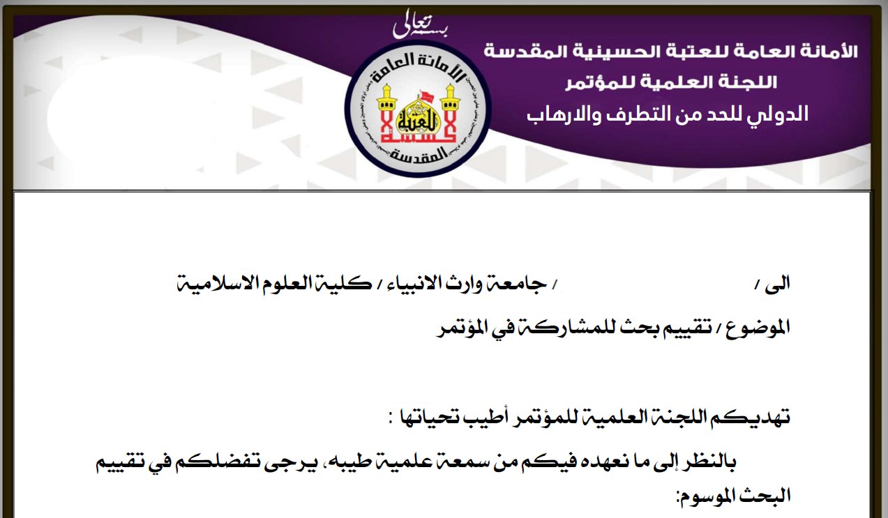 بدأ كلية العلوم الإسلامية بجامعة وارث الأنبياء منذ تاريخ 4 نوفمبر 2023 تقييم علمي دقيق للبحوث المشاركة في مؤتمر دولي حمل عنوان "الحد من التطرف والإرهاب". تأتي هذه المبادرة كجزء من التعاون المثمر بين كلية العلوم الإسلامية والعتبة الحسينية المقدسة.