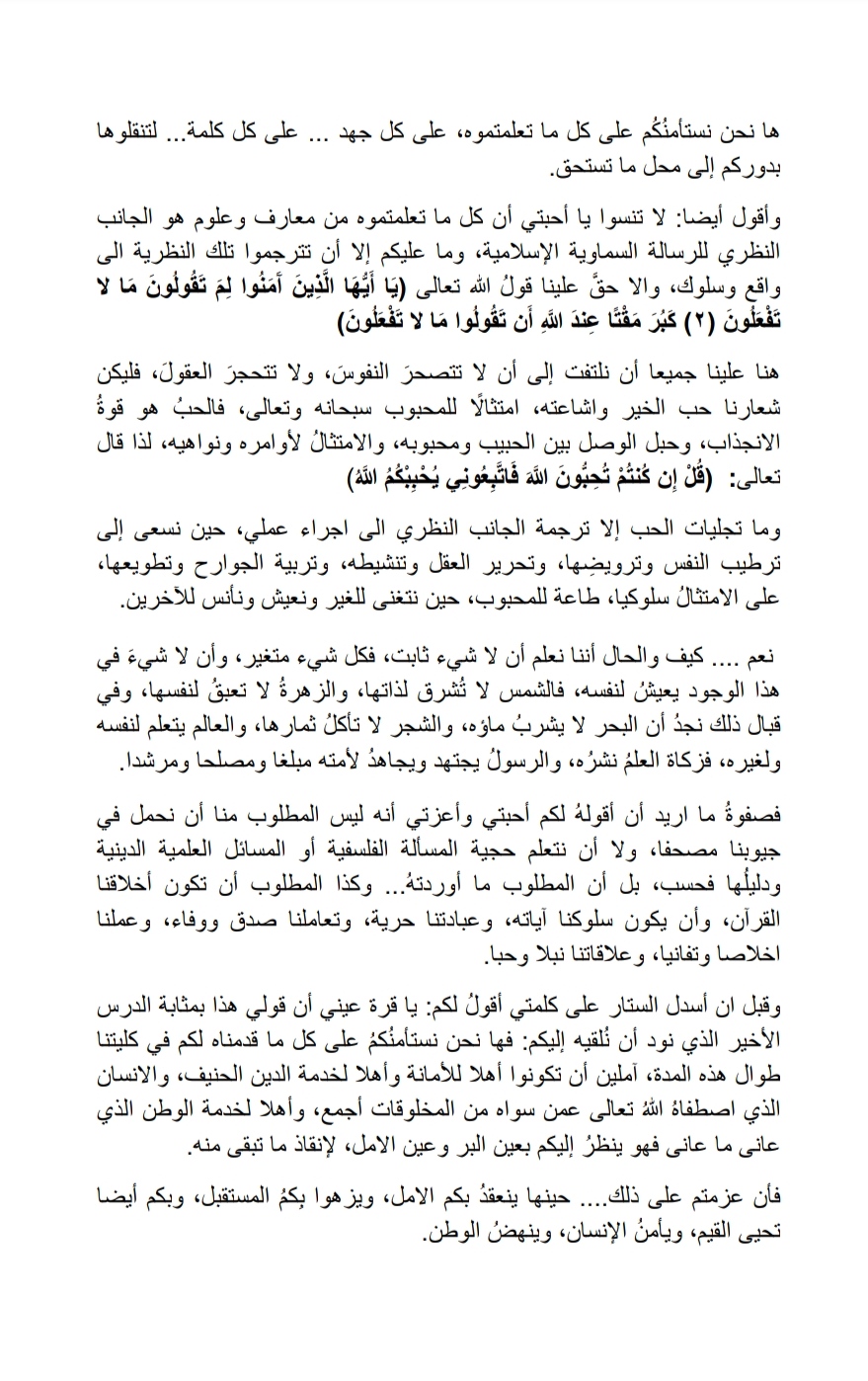 وجه السيد عميد كلية العلوم الإسلامية أ.م.د طلال فائق الكمالي المحترم كلمة خلال حفل تخرج الدفعة الأولى لطلبة الكلية والتي كانت تحمل شعار بالعلم تبنى الاوطان.
