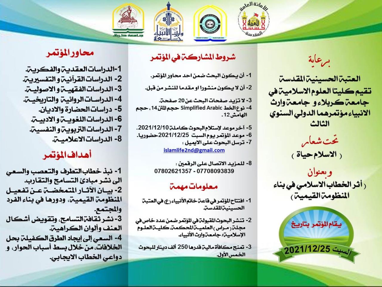 نظرا لمصادفة المؤتمر العلمي ( اثر الخطاب الاسلامي في بناء المنظومة القيمية ) الذي تقيمه كلية العلوم الإسلامية في جامعة كربلاء وبالتعاون مع كلية العلوم الإسلامية في جامعة وارث الانبياء وبرعاية العتبة الحسينية المقدسة لشهري محرم وصفر تقرر تأجيله إلى يوم السبت الموافق 23/10/2021 علما أن اخر موعد لاستلام البحوث سيكون في 10/10/2021