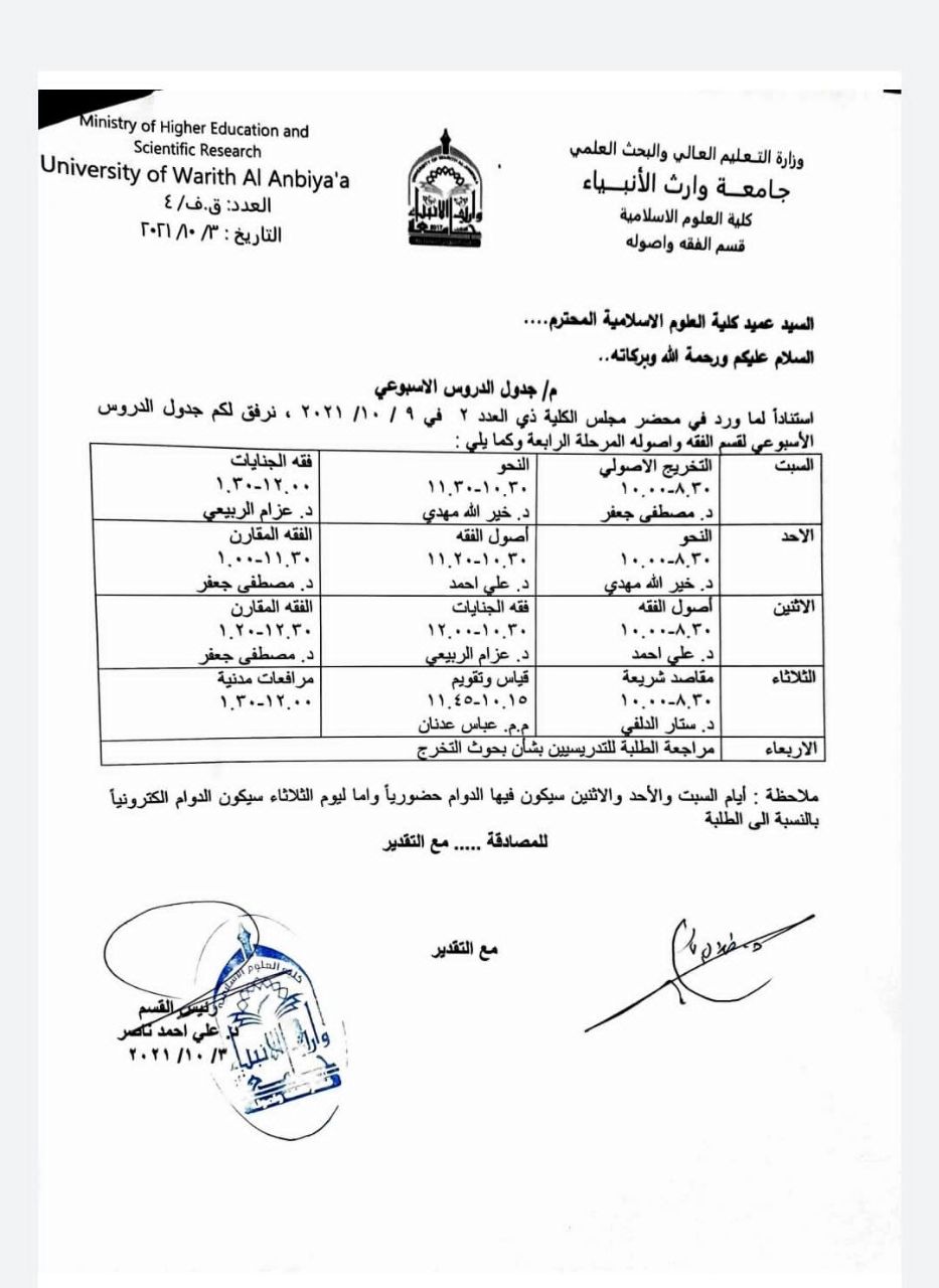 جدول الدروس الاسبوعي لقسم الفقه واصوله