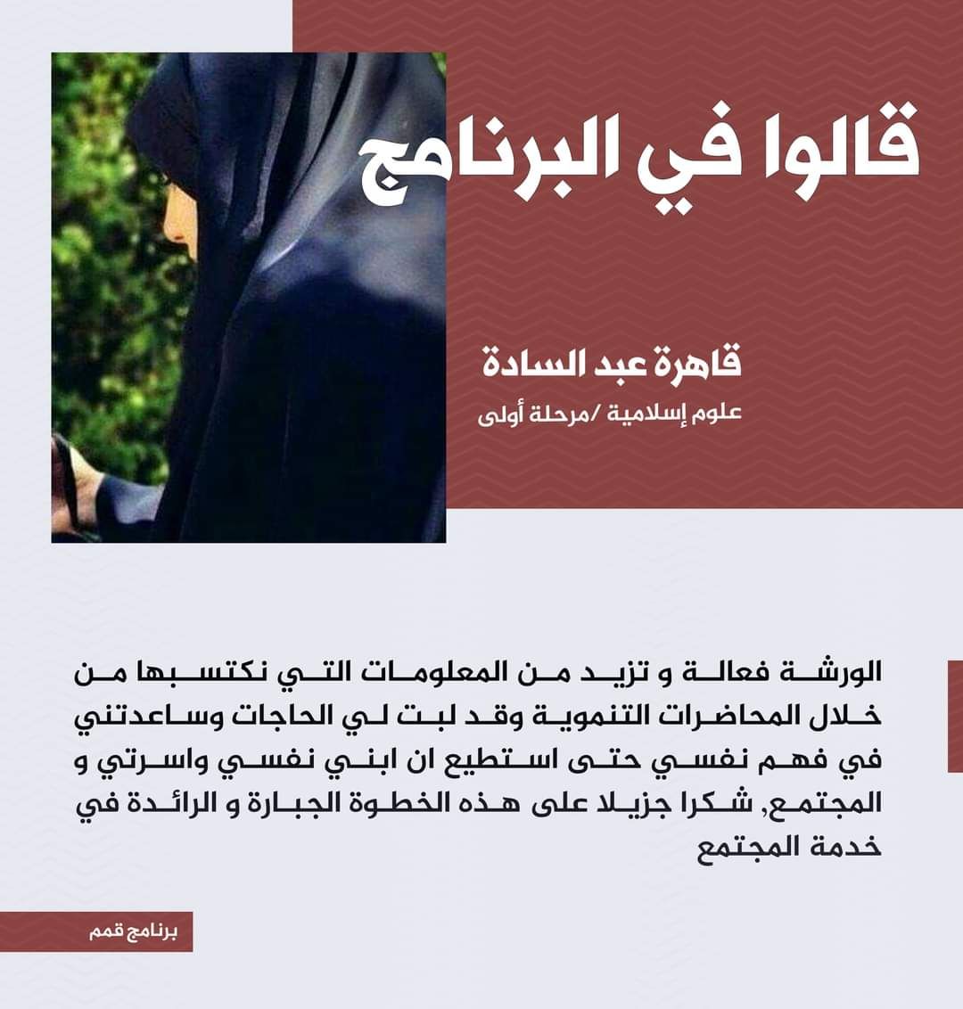 قمم يُنهي كورسه الأول باخلاقيات وثقة القائد المتميزاختتمت اليوم الخميس وعلى قاعات جامعة وارث الانبياء عليه السلام فعاليات الكورس التدريبي الأول ضمن برنامج قمم القيادي الذي تعده وتقدمه أكاديمية الوارث للتنمية البشرية والدراسات الاستراتيجية وكلية العلوم الاسلامية في جامعة وارث الانبياء عليه.ضم ختام الكورس التدريبي الأول محاضرات الأخلاق للأستاذ المساعد الدكتور طلال الكمالي عميد كلية العلوم الاسلامية، والثقة بالنفس للقائد بتقديم المدربة المعتمدة نبأ القريشي، حيث قدمت المحور التدريبي الجديد الذي دخل حيز التنفيذ ضمن متطلبات الكورس الأول، وبهذا المحور اكملت المتطلبات الرئيسة تطبيقيا ونظريا لكل المواد المخصصة للتدريب، وسط تفاعل فعال من قبل المشتركين في البرنامج.وستتم المباشرة في مضامين الكورس الثاني مطلع شهر أيلول بمشيئة الله تعالى.