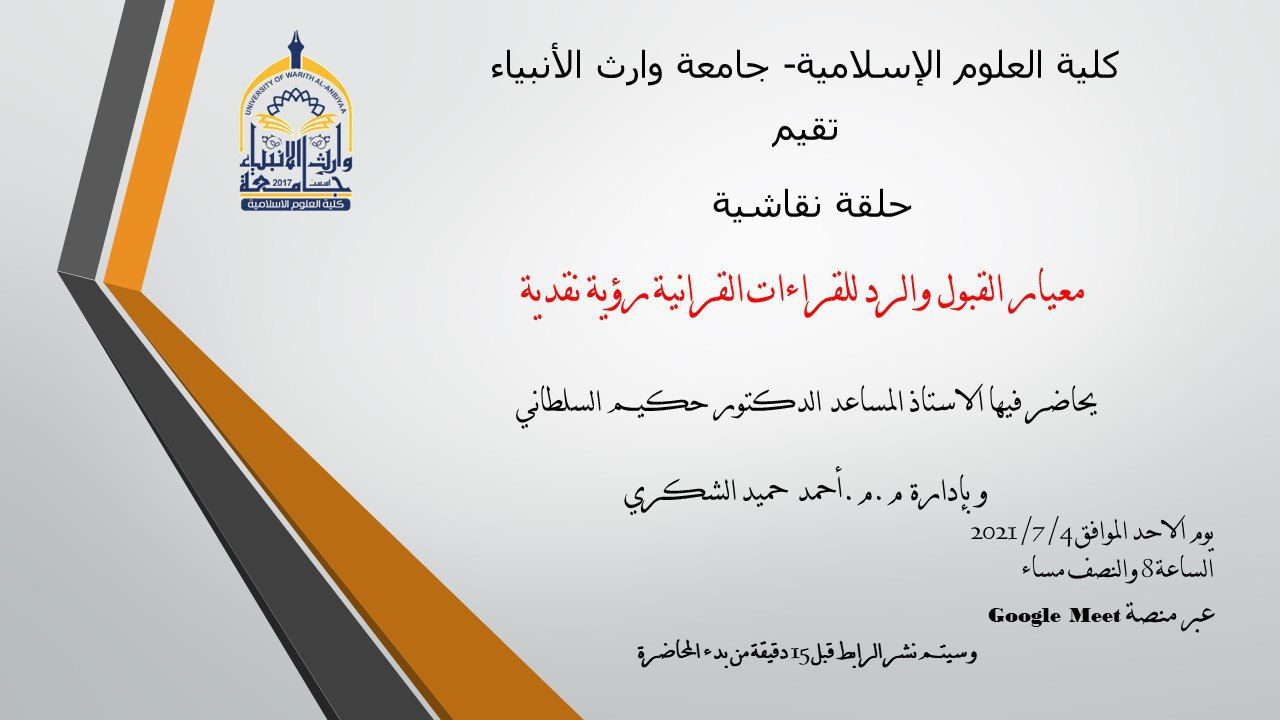http://meet.google.com/fcp-tngi-txc رابط الدخول الحلقة النقاشية معيار القبول والرد للقراءات القرآنية. رؤية نقدية والتي يحاضر فيها أ.م.د حكيم السلطاني