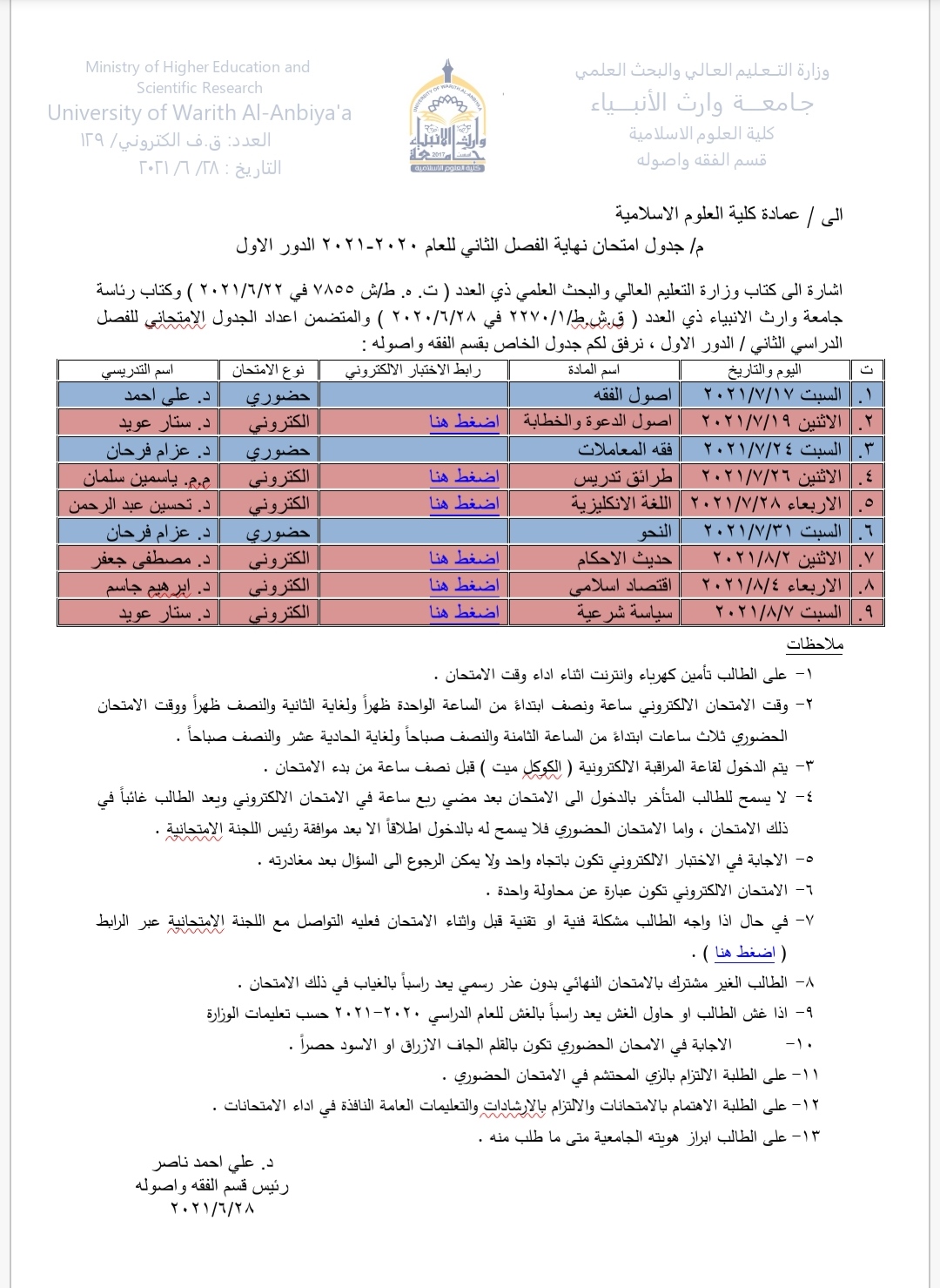 استعدادات كلية العلوم الإسلامية للامتحانات النهائية للفصل الثاني من العام الدراسي 2020-2021 الحضورية والالكترونية