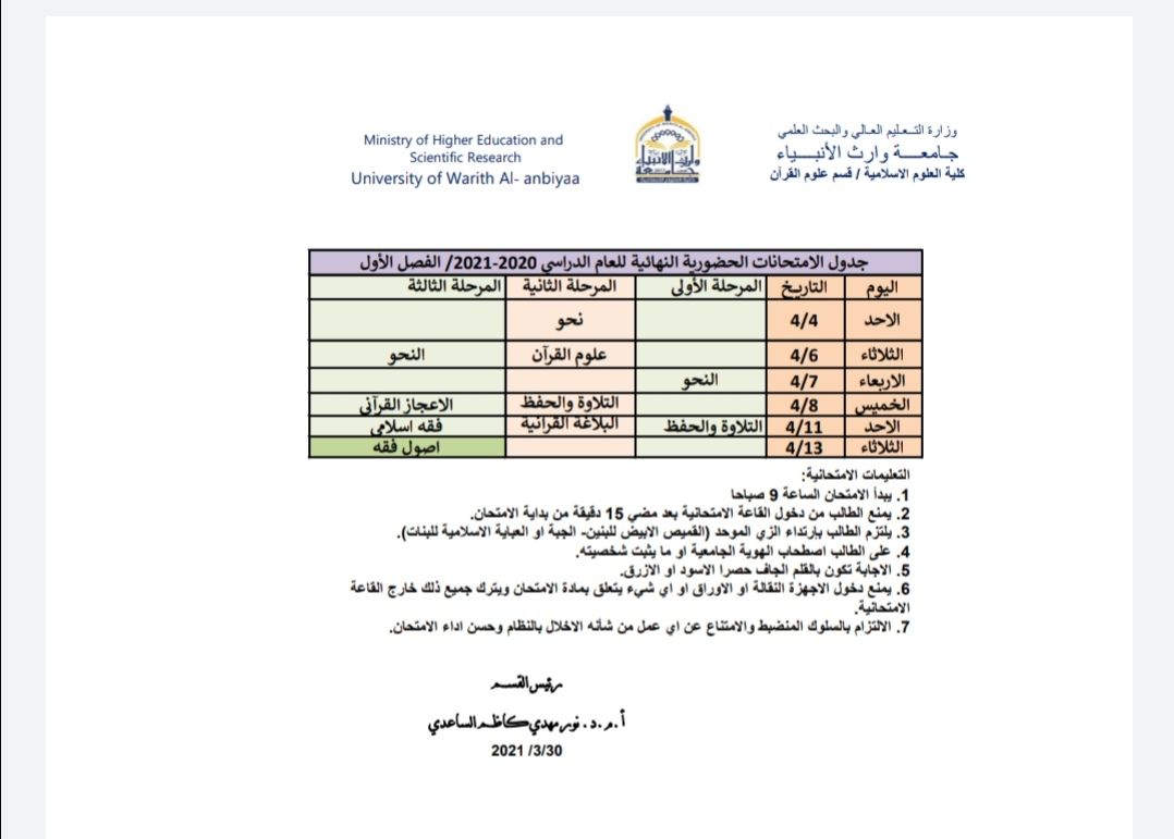 جدول الامتحانات النهائية الحضورية لقسم علوم القرآن للفصل الاول