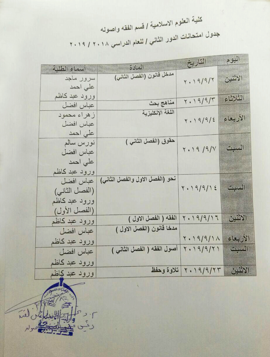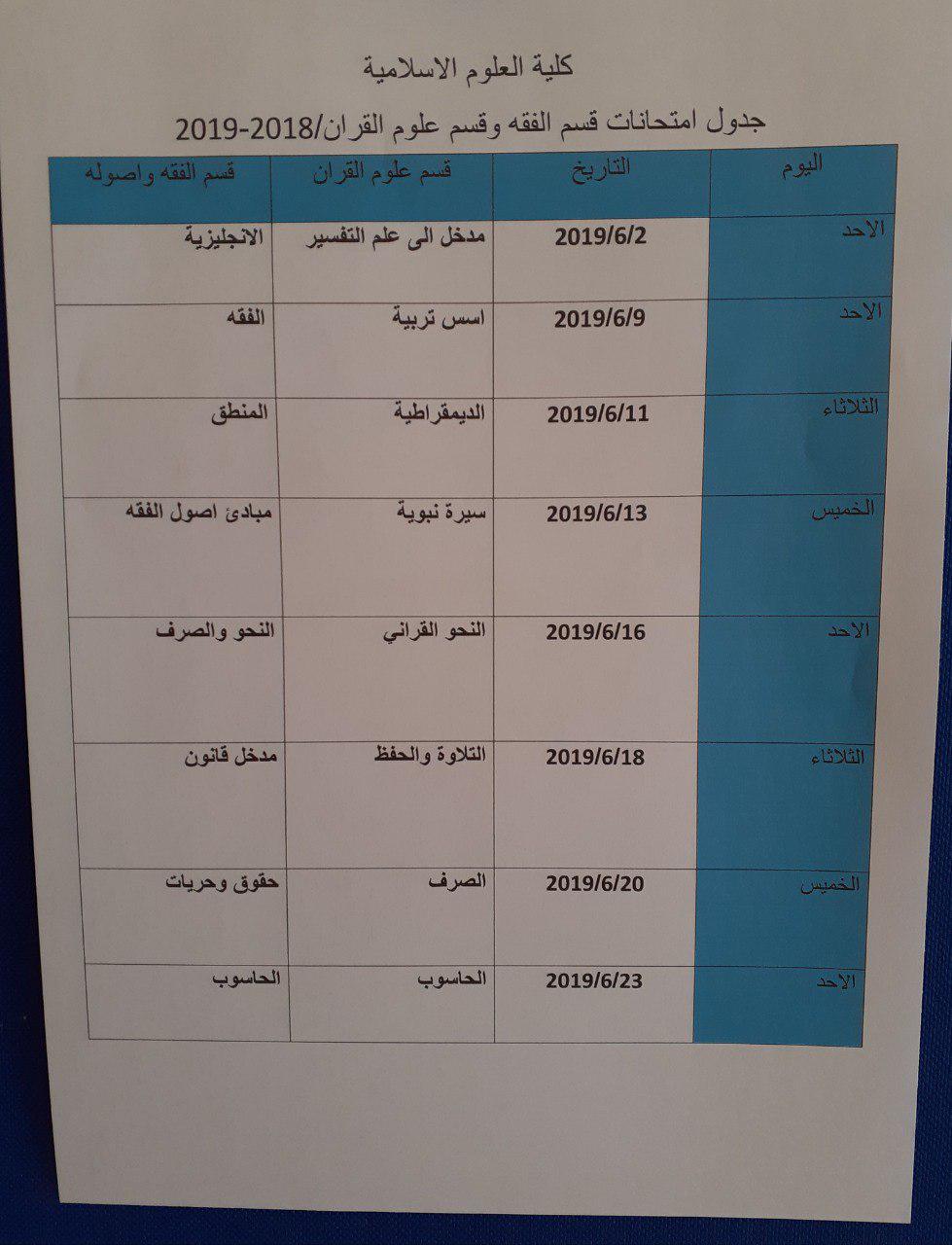 جدول امتحانات الدور الثاني للعام الدراسي 2018-2019 لقسمي (الفقه واصوله, علوم القران)علماً ان ابتداء الامتحان سيكون في 2-9-2019