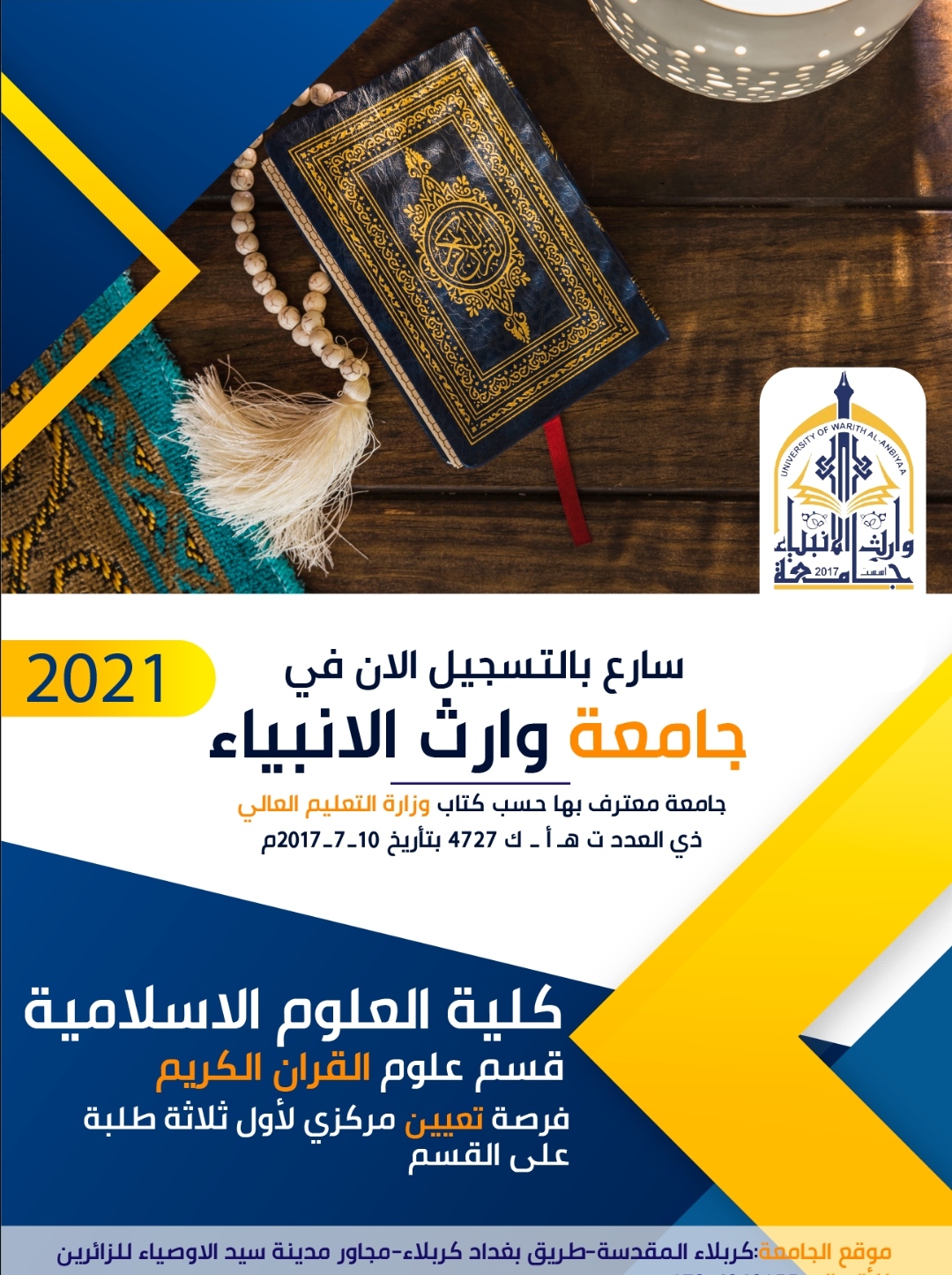 تعلن كلية العلوم الاسلامية في جامعة وارث الانبياء التابعة للعتبة الحسينية المقدسة عن قرب فتح التقديم الى اقسامها الثلاثة :