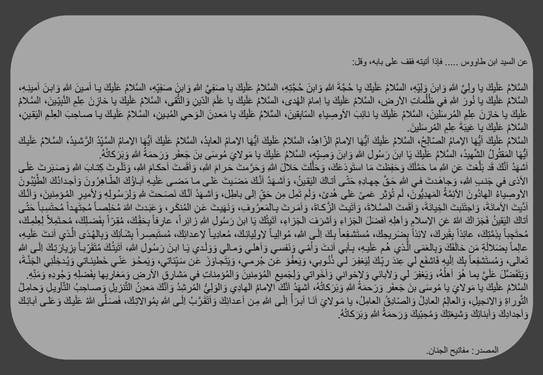 السَّلامُ عَلَيكَ يا ولِيَّ اللهِ وَابنَ وَلِيِّهِ، السَّلامُ عَلَيكَ يا حُجَّةَ اللهِ وَابنَ حُجَّتِهِ، السَّلامُ عَلَيكَ يا صَفِيَّ اللهِ وَابنَ صَفِيِّهِ، السَّلامُ عَلَيكَ يا اَمينَ اللهِ وَابنَ اَمينِهِ، السَّلامُ عَلَيكَ يا نُورَ اللهِ في ظُلُماتِ الاَرضِ، السَّلامُ عَلَيكَ يا اِمامَ الهُدى، السَّلامُ عَلَيكَ يا عَلَمَ الدّينِ وَالتُّقى، السَّلامُ عَلَيكَ يا خازِنَ عِلمِ النَّبِيّينَ، السَّلامُ عَلَيكَ يا خازِنَ عِلمِ المُرسَلينَ، السَّلامُ عَلَيكَ يا نائِبَ الاَوصِياءِ السّابِقينَ، السَّلامُ عَلَيكَ يا مَعدِنَ الوَحيِ المُبينِ، السَّلامُ عَلَيكَ يا صاحِبَ العِلمِ اليَقينِ، السَّلامُ عَلَيكَ يا عَيبَةَ عِلمِ المُرسَلينَ.
