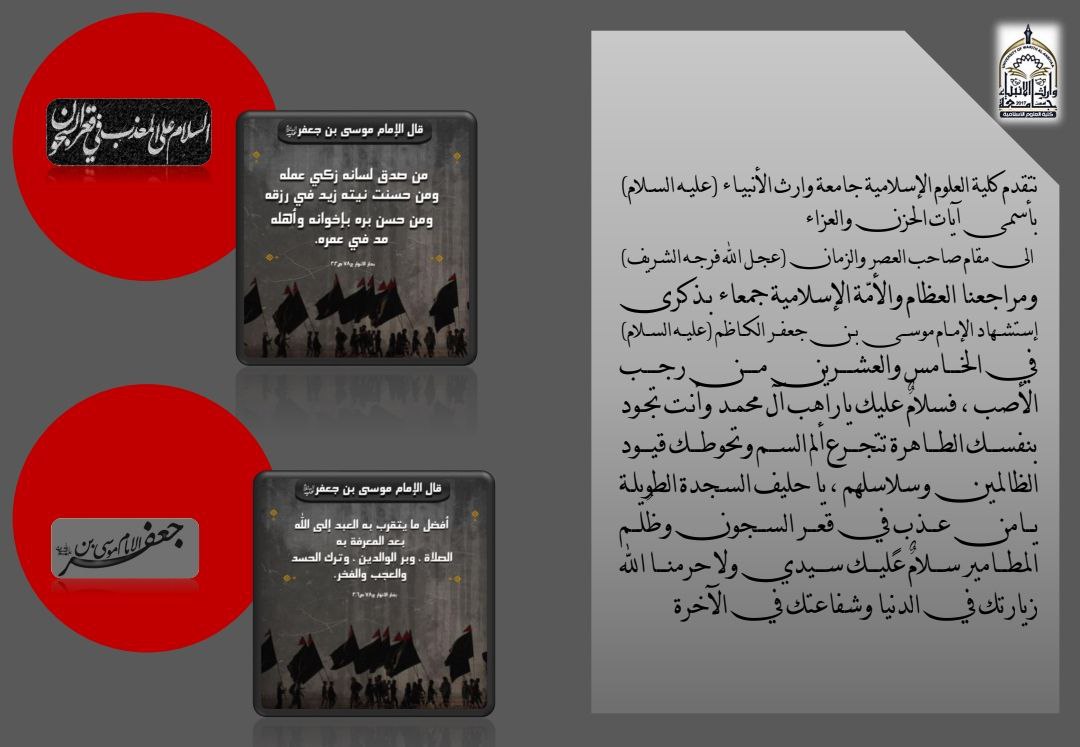 الى مقام صاحب العصر والزمان (عجل الله فرجه الشريف) ومراجعنا العظام والأمّة الإسلامية جمعاء بذكرى إستشهاد الإمام موسى بن جعفر الكاظم (عليه السلام) في الخامس والعشرين من رجب الأصب ، فسلامٌ عليك ياراهب آل محمد وأنت تجود بنفسك الطاهرة تتجرع ألم السم وتحوطك قيود الظالمين وسلاسلهم ، يا حليف السجدة الطويلة يامن عذبٍ في قعر السجون وظُلم المطامير سلامٌ عليك سيدي ولا حرمنا الله زيارتك في الدنيا وشفاعتك في الآخرة