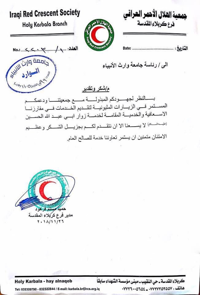 قدمت جمعية الهلال الأحمر فرع كربلاء المقدسة كتاب شكر وتقدير الى رئاسة جامعة وارث الانبياء التابعة للعتبة الحسينية المقدسة نظراً للجهود المبذولة من قبل الجامعة وتعاونها ودعمها المستمر للجمعية في الزيارات المليونية خدمتاً لزوار الامام الحسين عليه السلام