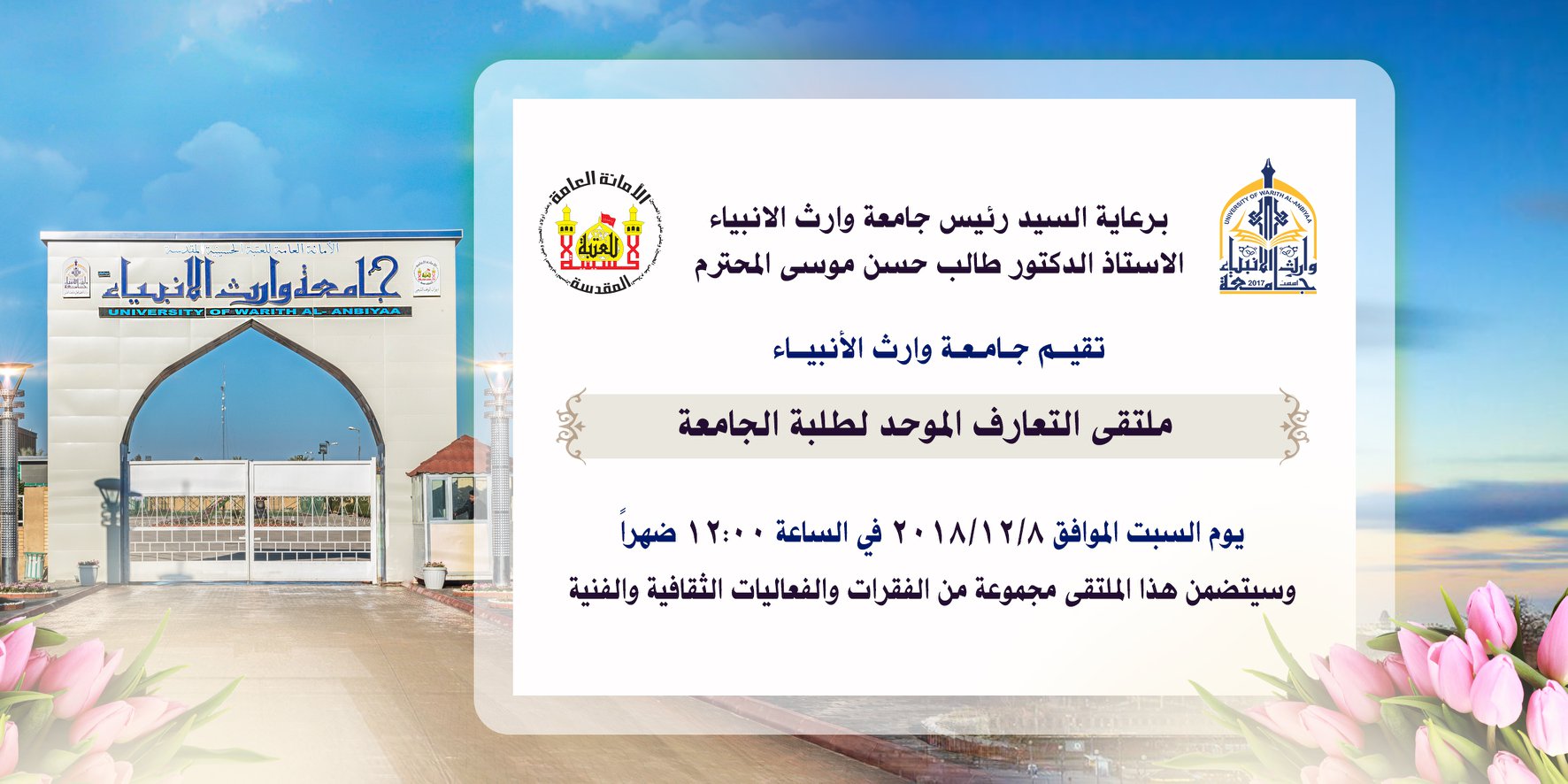 بمناسبة الذكرى الاولى لإعلان النصر على عصابات داعش الاجرامية وتحرير كامل الاراضي العراقيه يتقدم الاستاذ الدكتور طالب حسن موسى رئيس جامعة وارث الانبياء #التابعة_للعتبة_الحسينية_المقدسة والمساعد الإداري والعلمي وكافة منتسبي الجامعة بأجمل التهاني والتبريكات لقواتنا المسلحة البطلة بكافة صنوفها وقوات الحشد الشعبي المقدس ويبارك لسماحة اية الله العظمى السيد علي السيستاني(دام ظله) صاحب الفتوى التاريخية في الجهاد الكفائي دفاعا عن العراق وشعبه ومقدساته تحية اكبار لشهداء العراق وارواحهم الطاهرة ولآبائهم وامهاتهم وعوائلهم ، ولكل من فقد عزيزا في ساحة المواجهات او جراء التفجيرات الارهابية ولكل جريح وقف في وجه الارهاب , فلكم النصر دائماً ولأعدائكم الذل والهوان.
