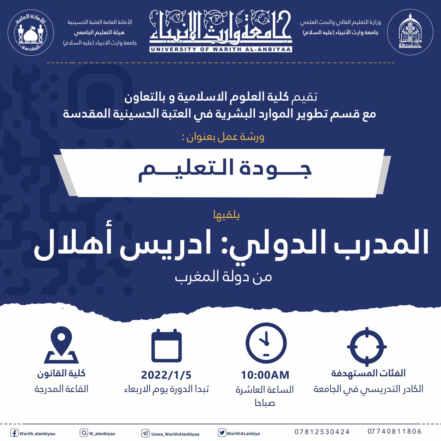 يقيم مركز التعليم المستمر في جامعة وارث الانبياء (عليه السلام) بالتعاون مع كلية الادارة والاقتصاد حلقة نقاشية بعنوان "التعلم عن بعد"، يلقيها ... أ.د عواد كاظم شعلان الخالدي يوم السبت الموافق 1/8/ 2022. وتقام حضورياً على احدى القاعات الدراسية في بناية العُلا وفي تمام الساعة 11:00 صباحاً.لاعضاء الهيئات التدريسية في كليات الجامعة