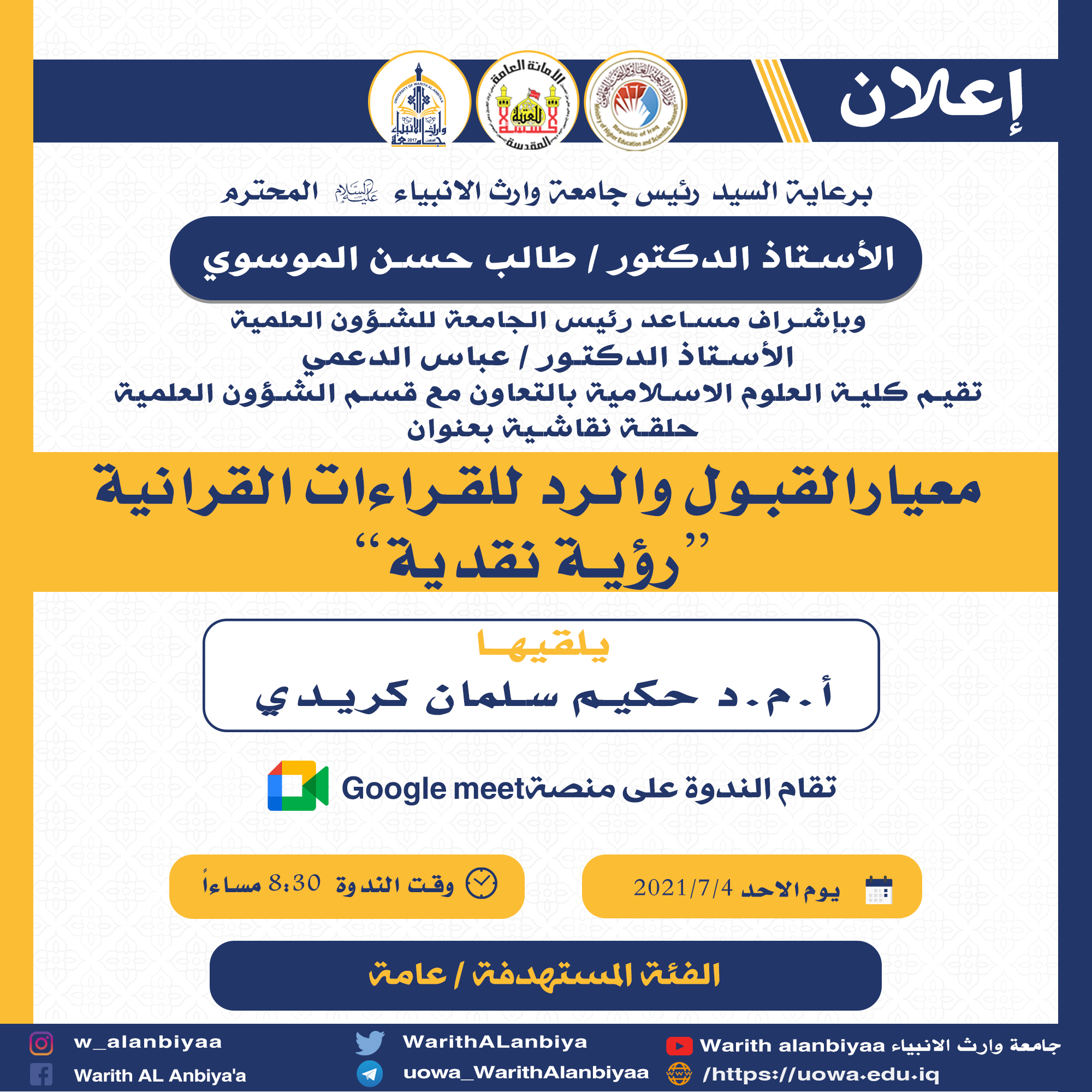 http://meet.google.com/fcp-tngi-txc رابط الدخول الحلقة النقاشية معيار القبول والرد للقراءات القرآنية. رؤية نقدية والتي يحاضر فيها أ.م.د حكيم السلطاني