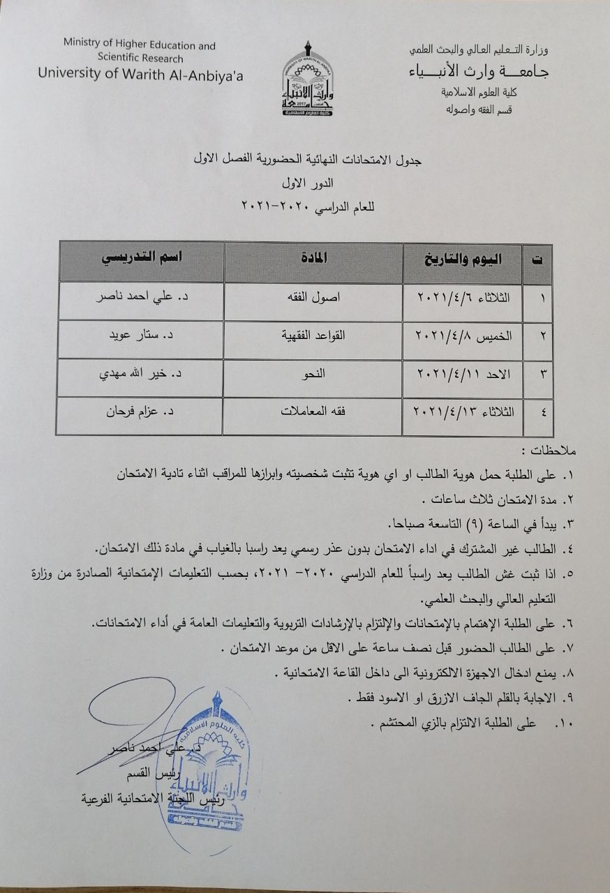 جدول الامتحانات النهائية الحضورية لقسم الفقه واصوله للفصل الاول