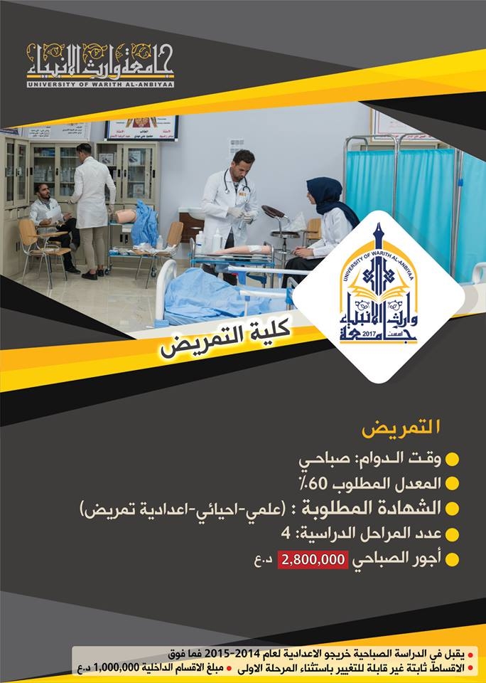 كلية التمريض في جامعة وارث الانبياء: تقبل هذه الكلية خريجوا الدراسة الاعدادية ( العلمي ، الاحيائي) واعدادية التمريض والقبالة وباجور دراسية 2,800,000 تسدد على ثلاث دفعات علما ان الحد الادنى لمعدل القبول هو 60٪؜