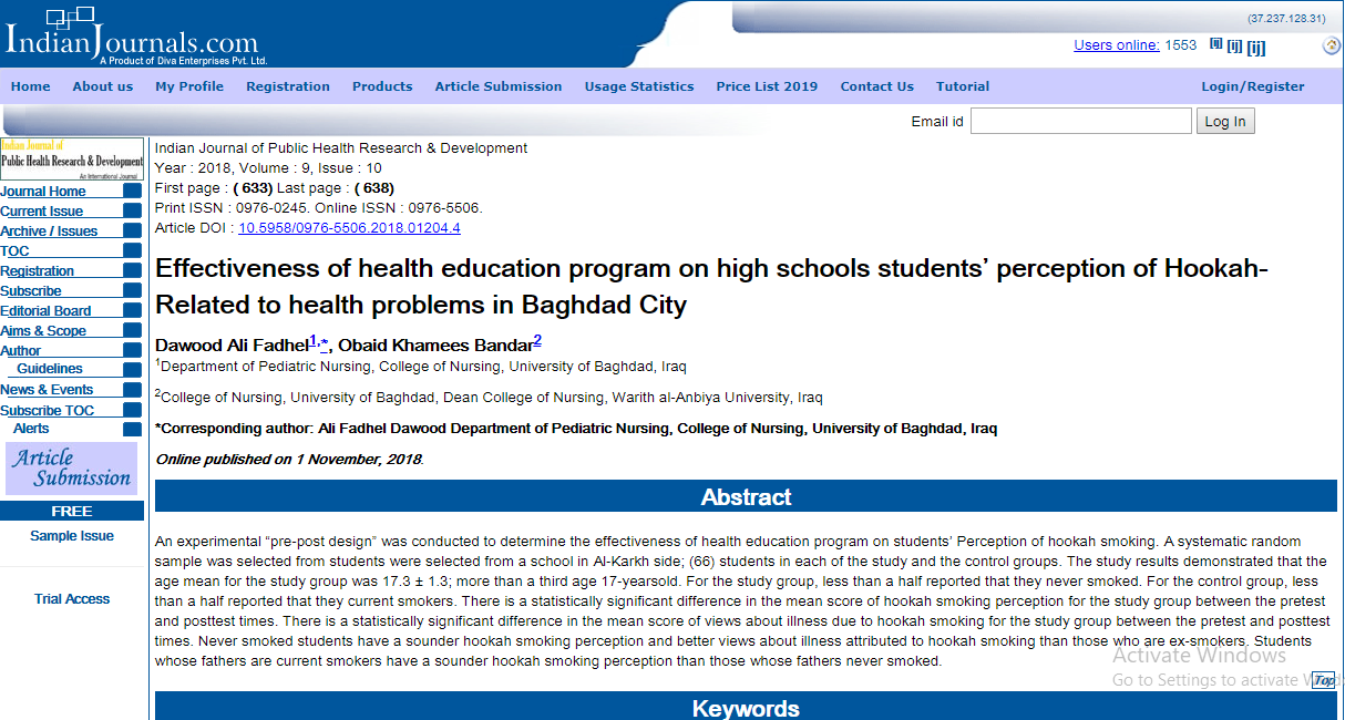 نشر أ.م.د.خميس بندر عبيد السعيدي عميد كلية التمريض/جامعة وارث الانبياء بحثين علميين في مجلة عالمية ضمن موقع (scopus) وهذا يعد حلقه تضاف الى سلسلة حلقات انجازات الدكتور العميد وانجازات كلية التمريض /جامعة وارث الانبياء.