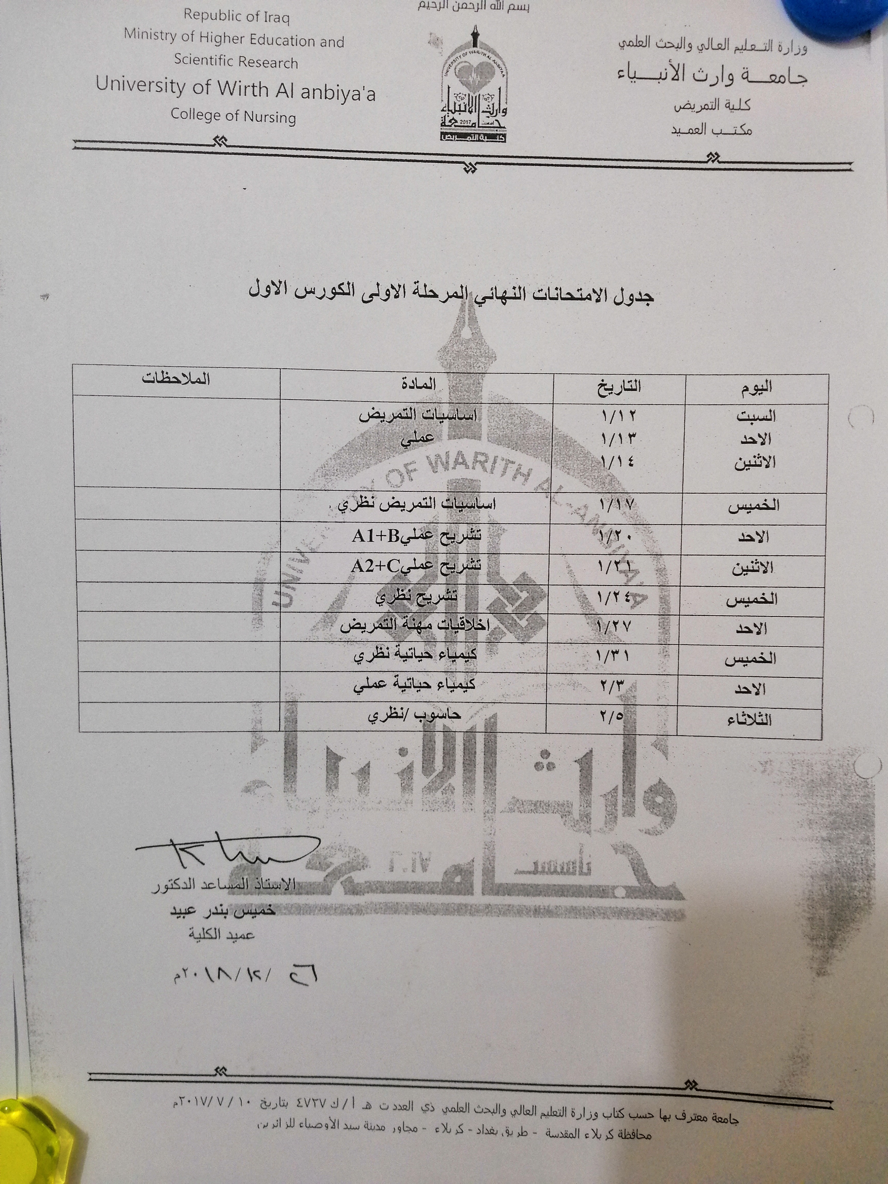 جدول امتحانات نهاية الكورس الاول للمرحلتين الاولى والثانيه