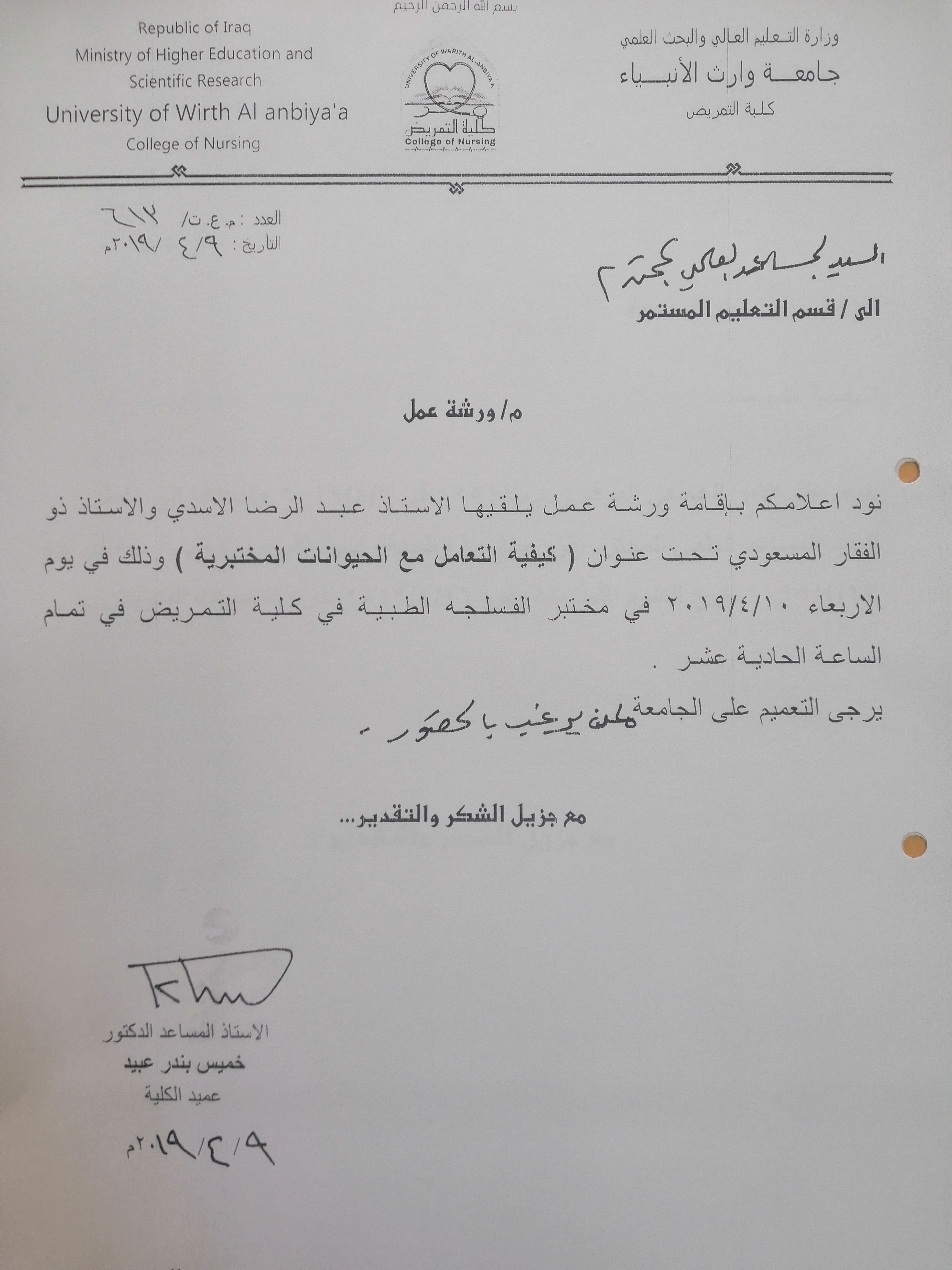 اهتماما بالجانب العلمي والمعرفي تعلن كلية التمريض عن اقامة ورشة عمل تحت عنوان (كيفية التعامل مع الحيوانات المختبرية)،