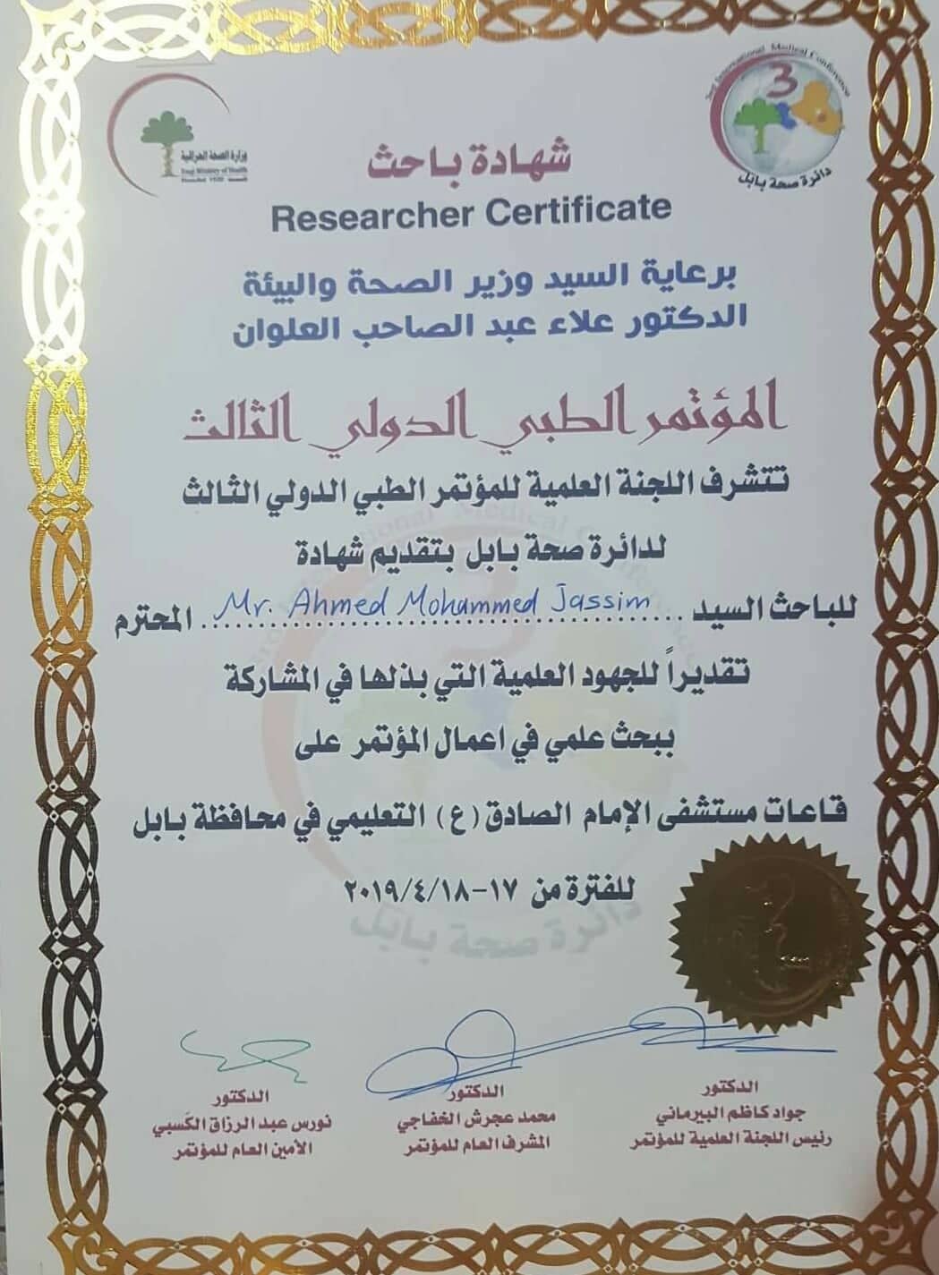 شارك الباحث المدرس المساعد في جامعة وارث الأنبياء في كربلاء احمد محمد جاسم في المؤتمر الطبي الدولي الثالث الذي اقامته دائرة صحة بابل والذي حمل بحثه عنوان السيطرة على العدوى من خلال تقييم ممارسات الممرضين حول الكيفية السيطرة على العدوى ( التهاب الكبد الفايروسي ) في وحدات الفشل الكلوي ( الديلزة ) .18/4/2019