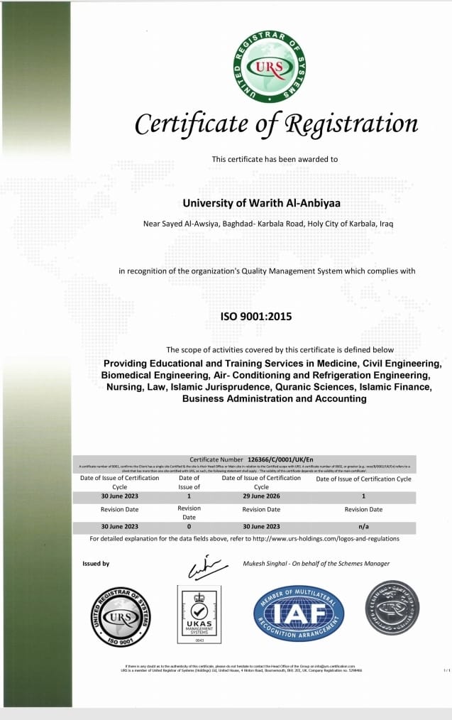 حصدت جامعة وارث الأنبياء(عليه السلام)، على ثلاث اعتمادات دولية مهمة في ادارة الجودة ISO 9001 والبيئة ISO 14001 والسلامة المهنية ISO 45001 من "المؤسسة الدولية البريطانية للاعتماد UKAS" بعد جهود متواصلة امتدت لاكثر من 10 أشهر من التدريب والتأهيل والتدقيق.