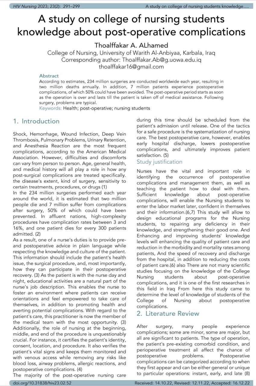 وجاءت هذه الدراسة عن معرفة طلاب كلية التمريض بالمضاعفات مابعد الجراحة، وواجب الممرض في الحد من المضاعفات او حالات الوفاة، وحسب الإحصائيات، يتم إجراء 234 مليون عملية جراحية في جميع أنحاء العالم كل عام، مما يؤدي إلى وفاة مليوني شخص سنويًا. بالإضافة إلى ذلك يعاني 7 ملايين مريض من مضاعفات ما بعد الجراحة، كان من الممكن تجنب 50٪ منها خلال فترة ما بعد الجراحة بمجرد انتهاء العملية وتستمر حتى يتم إخراج المريض من المساعدة الطبية.