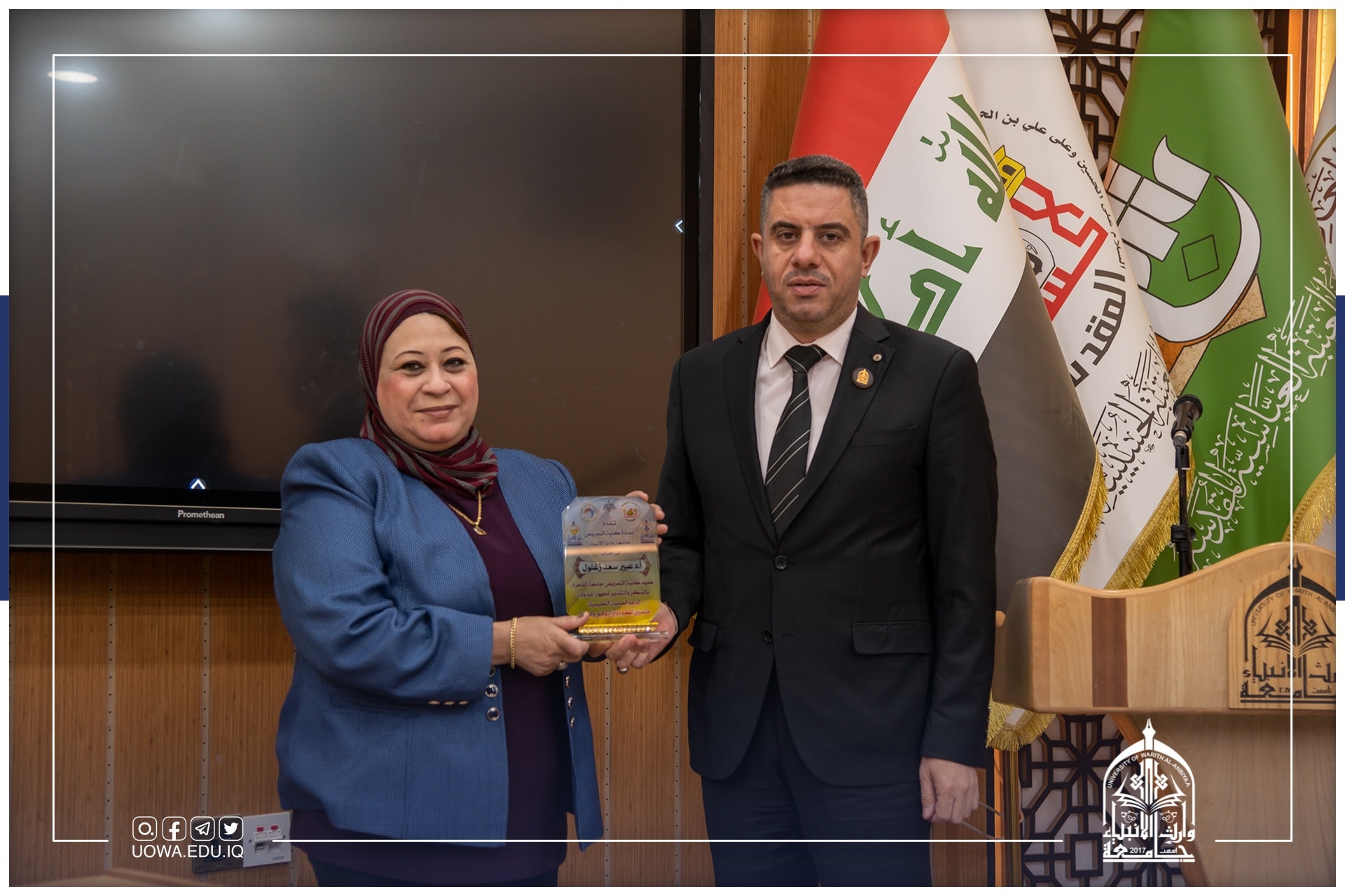 ورئاسة جامعة وارث الأنبياء (عليه السلام) متمثلة بكل من أ.د. ابراهيم الحياوي رئيس الجامعة، ومساعد رئيس الجامعة للشؤون العلمية أ.د. عباس الدعمي، عميدة الكلية النظيرة في جامعة القاهرة أ.د. عبير سعد زغلول.