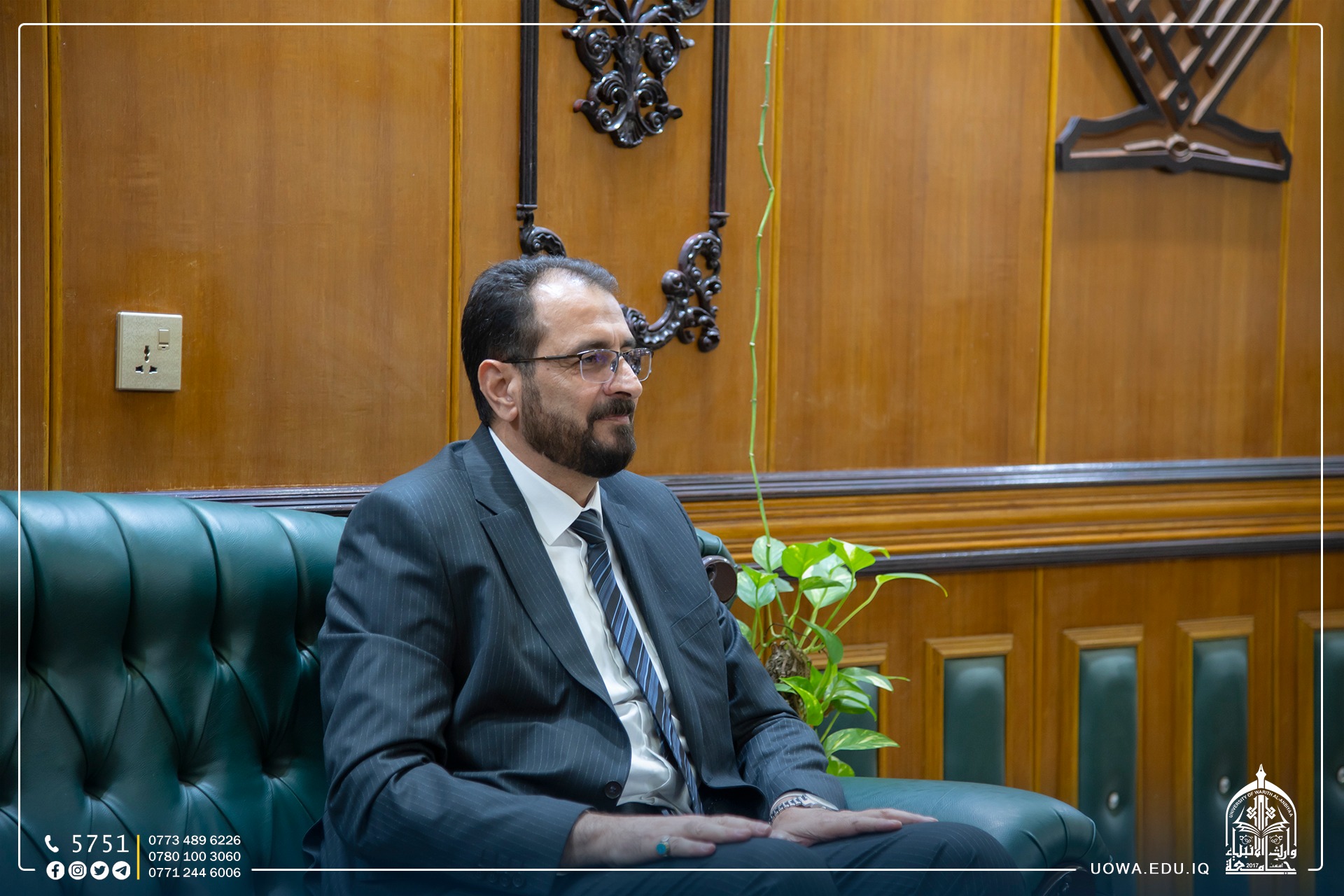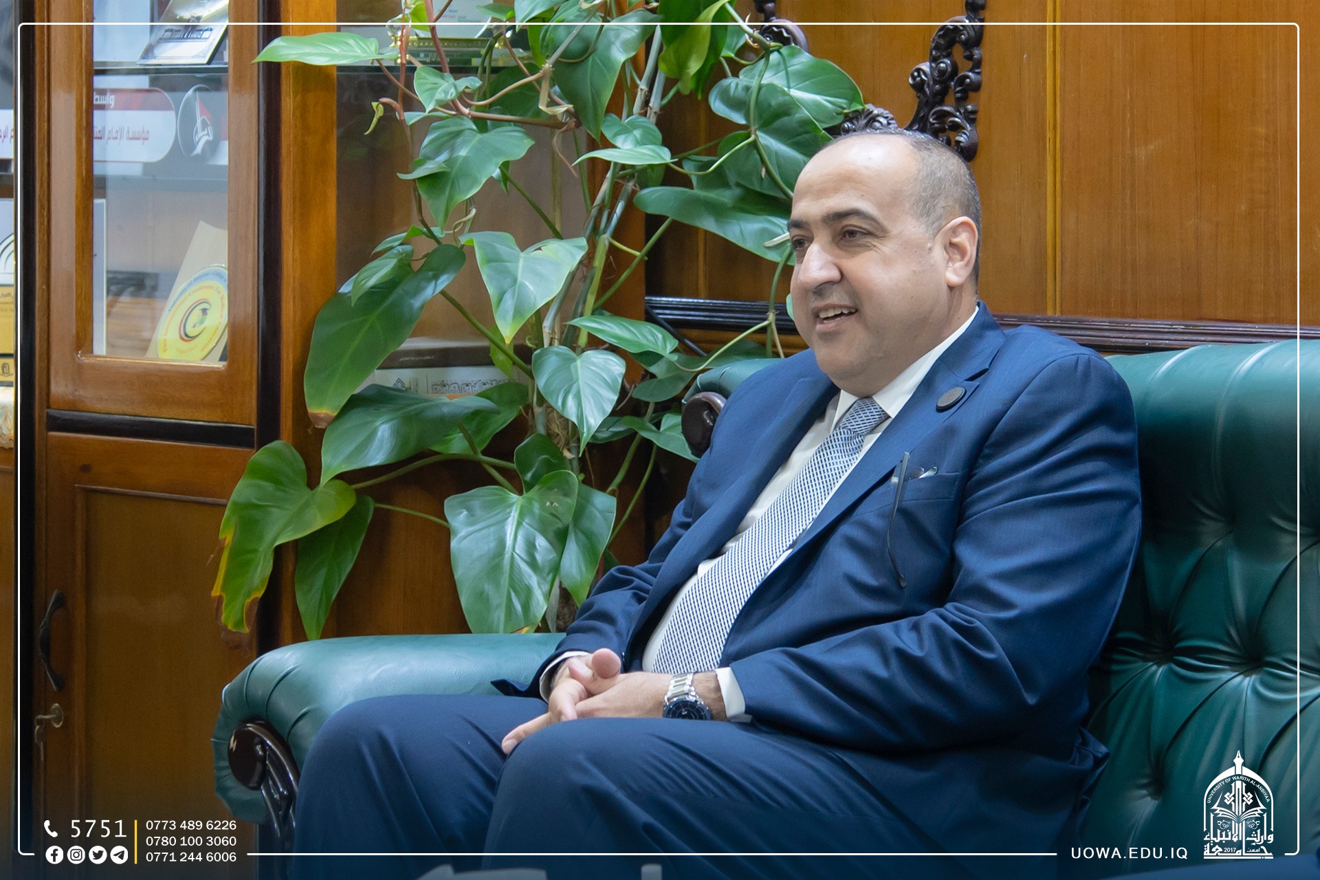 The President of the University, Dr. Ibrahim Al-Hayawi, received Dr. Basim Khalil Al-Saadi, the President of the University of Karbala, along with Dr. Akram Al-Yasiri, the Administrative Assistant. They visited the university to offer their congratulations to Dr. Hussein Hadi Hussein, Assistant Professor, on the occasion of his assumption of the deanship of the College of Engineering. They pray for his success in serving the scientific journey in our beloved country.