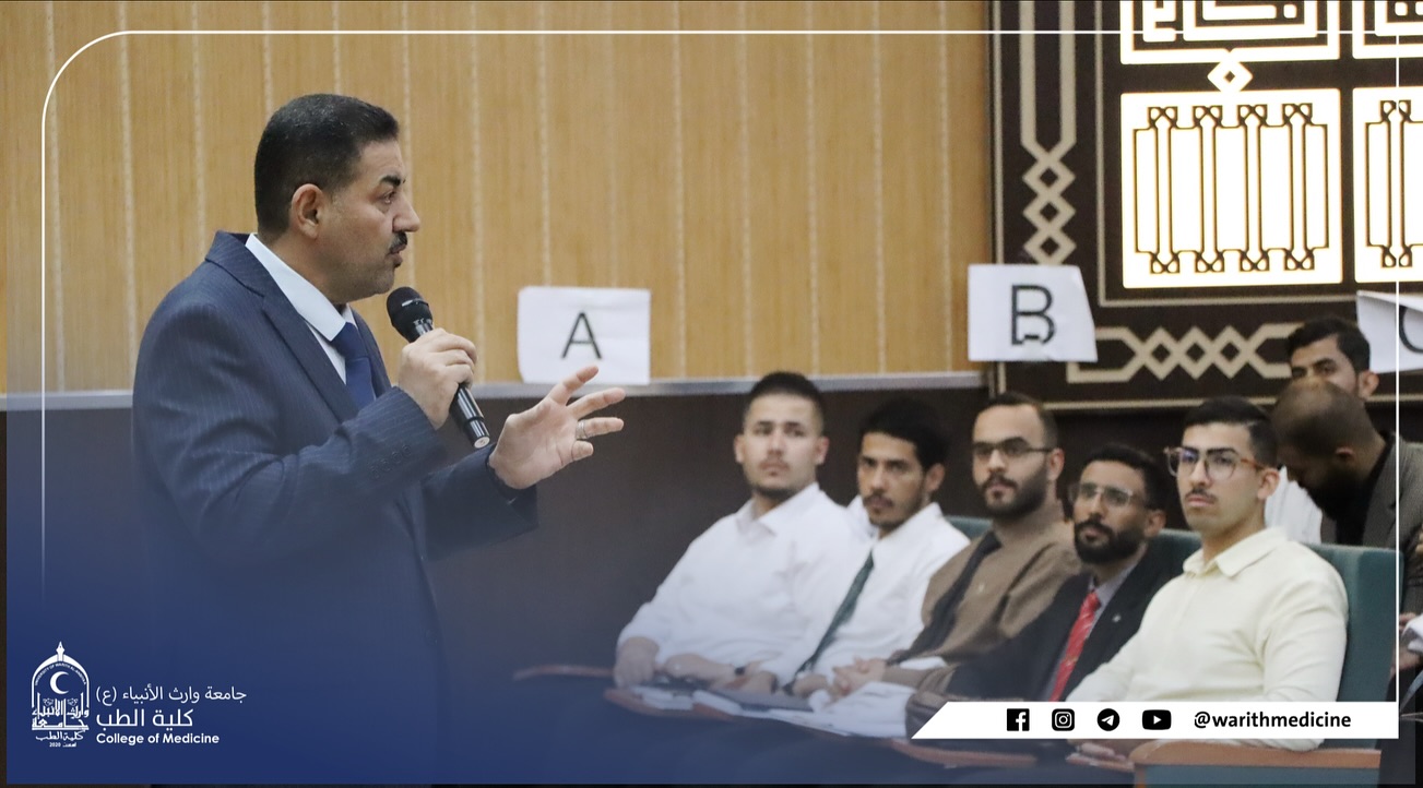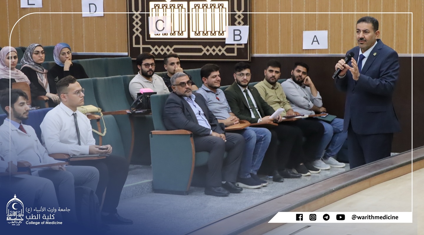 The Dean of the College of Medicine at Warith Al-Anbiya University (peace be upon him), Professor Dr. Ali Abdul Saadoun Al-Ghazi, and the Assistant Dean for Scientific Affairs, Professor Dr. Laith Mohammed Abbas, held a meeting with the college's teaching assistants to discuss the current state of academic and administrative work within the college and the role of teaching assistants in supporting the educational process.